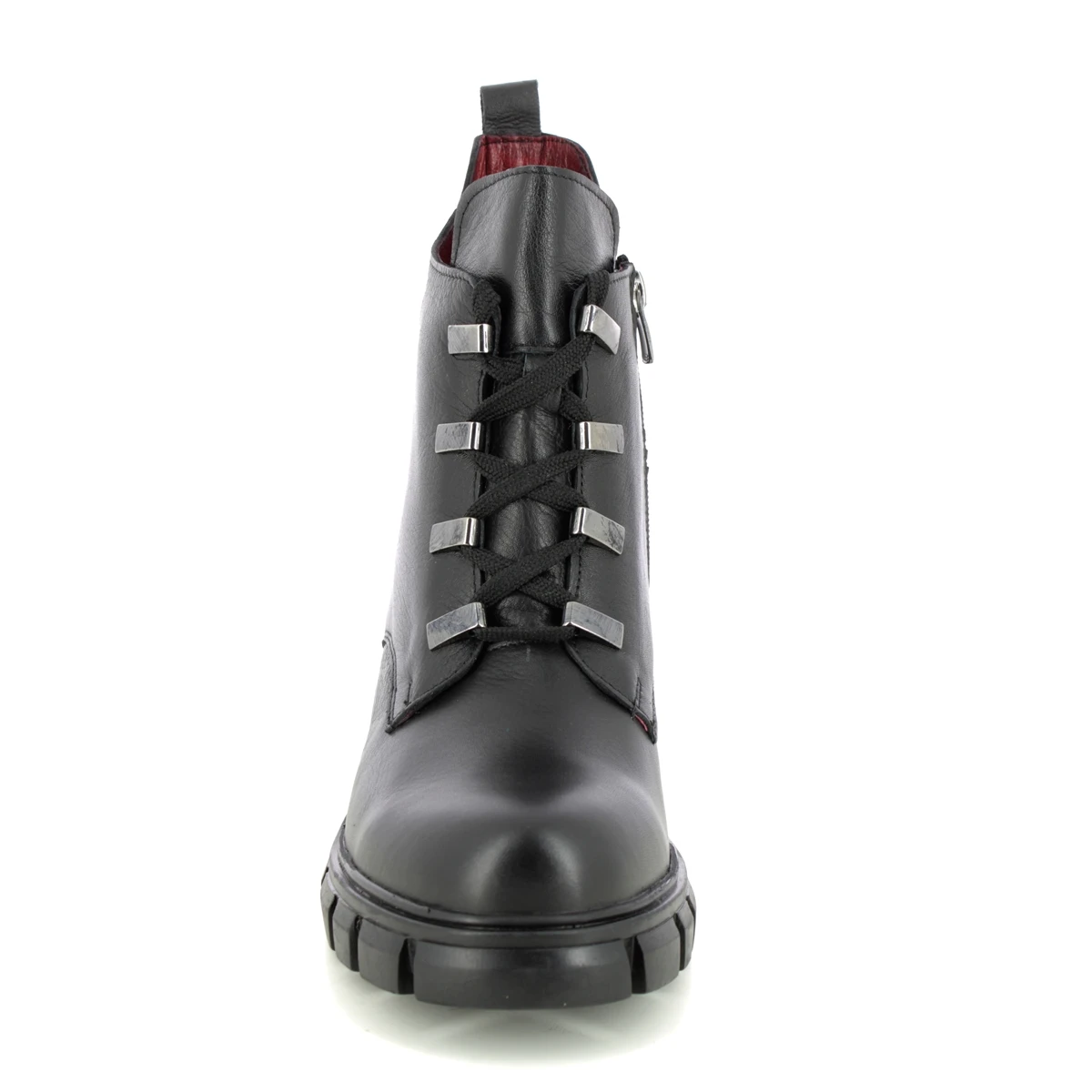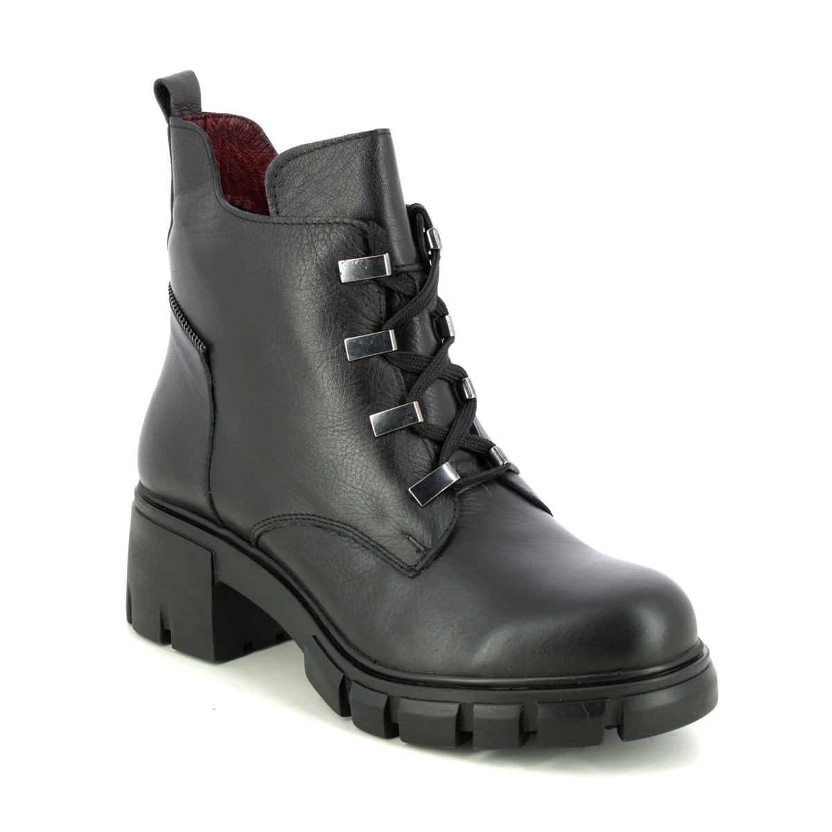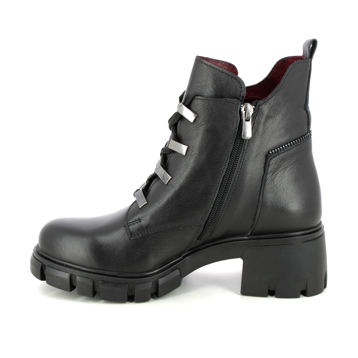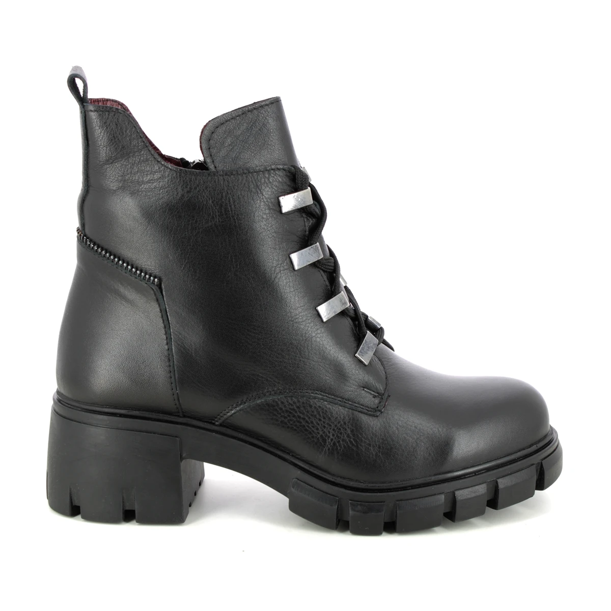 Lotus Lacie Lace women’s black leather ankle boots are bang on trend. These contemporary biker boots have a smooth leather upper with contrasting metallic zip detail and lace holes. The chunky cleated sole unit maintain the fashionable look so pair your black biker boots with turned up mom jeans and a white graphic tee.
