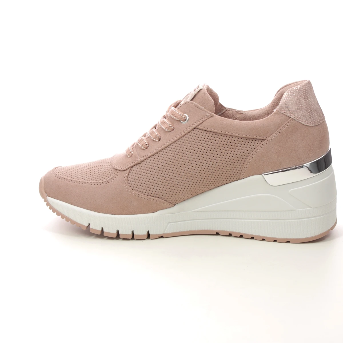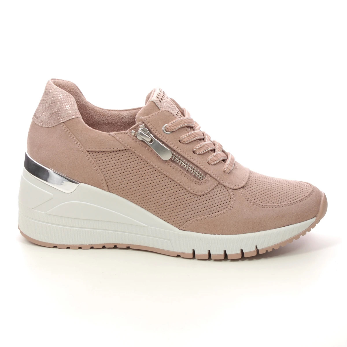 Marco Tozzi Rea Zip Wedge womens nude trainers have a soft perforated upper and a high wedge sole measuring 60mm.