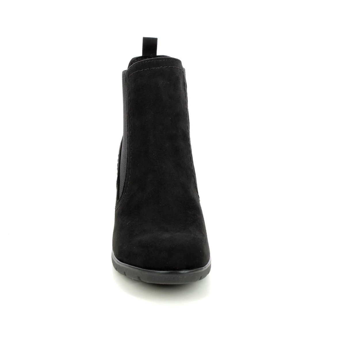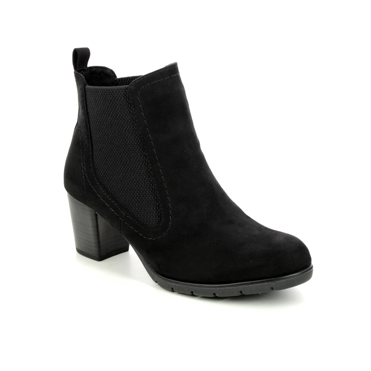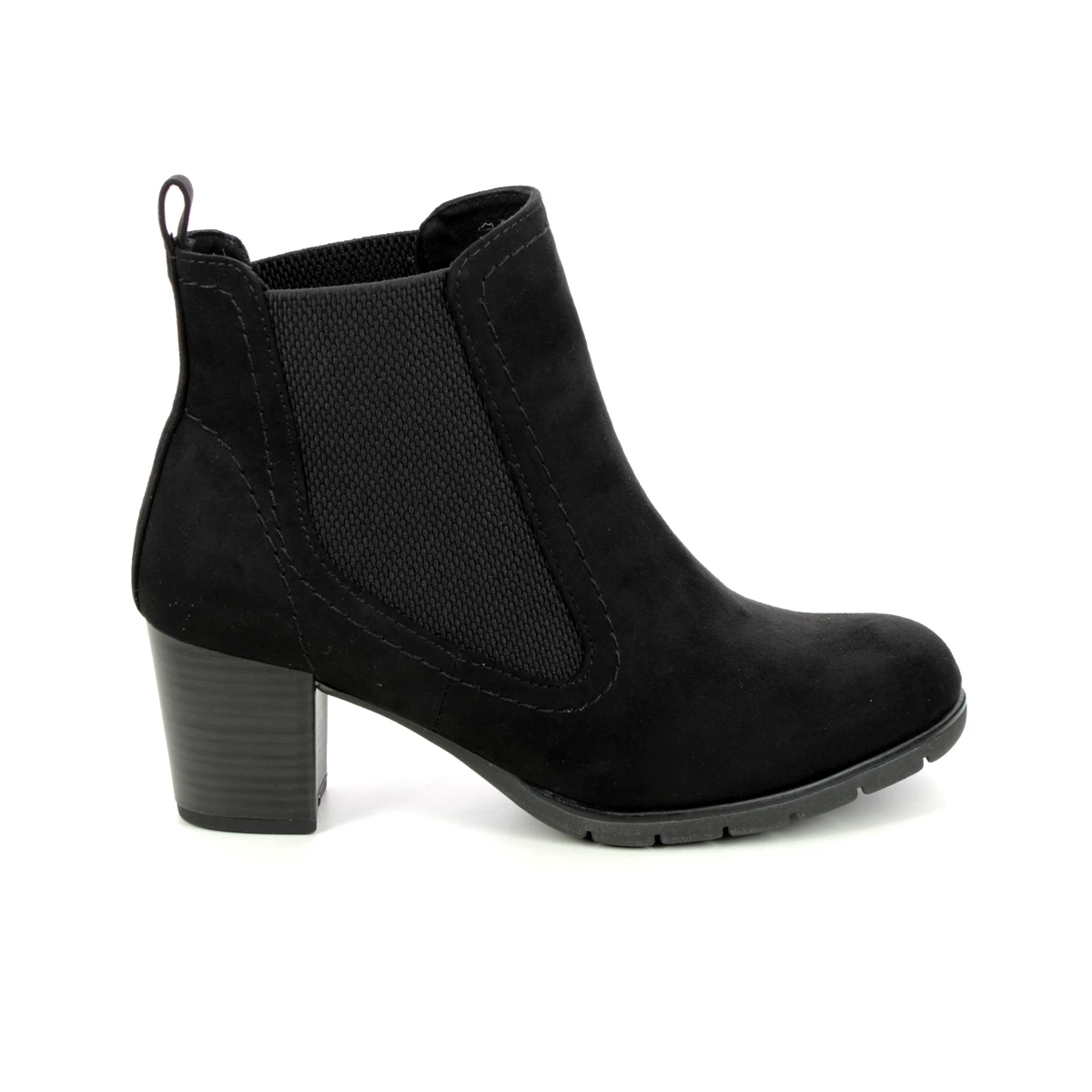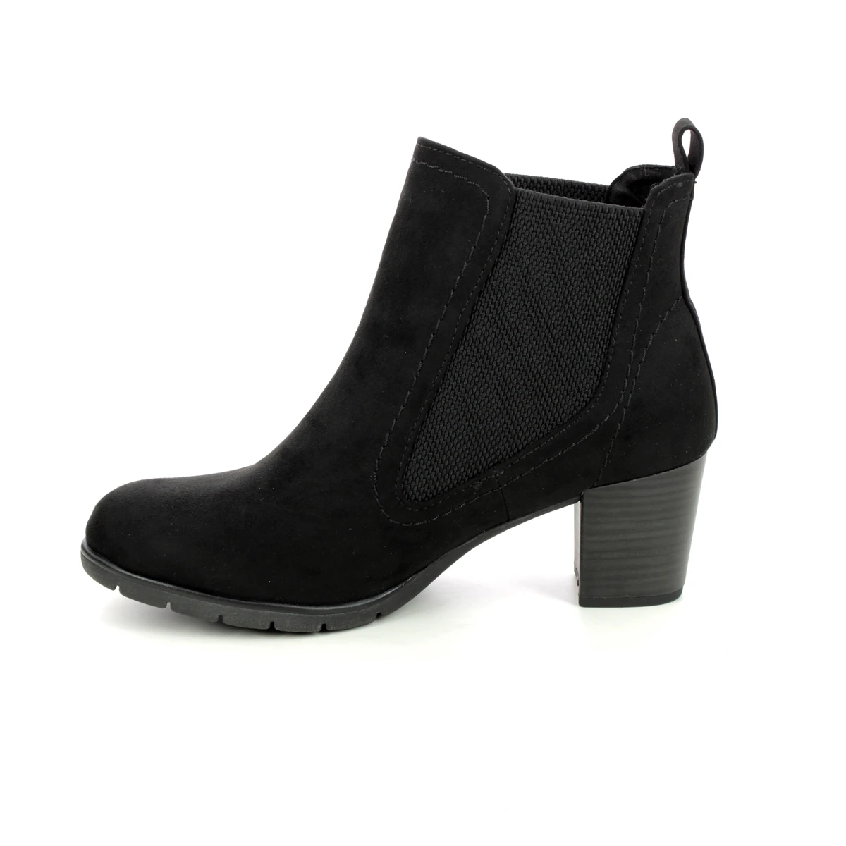 The Marco Tozzi black ankle boots are a classic style which can be worn with lots of outfits. The black, heeled boots are sophisticated and have a soft suede effect upper. The elastic side panels offer improved comfort. The stacked block heel measures 60mm and features Antishokk technology designed to protect your feet from fatigue. Pair with turned-up jeans and an off-shoulder jumper for a stylish look.