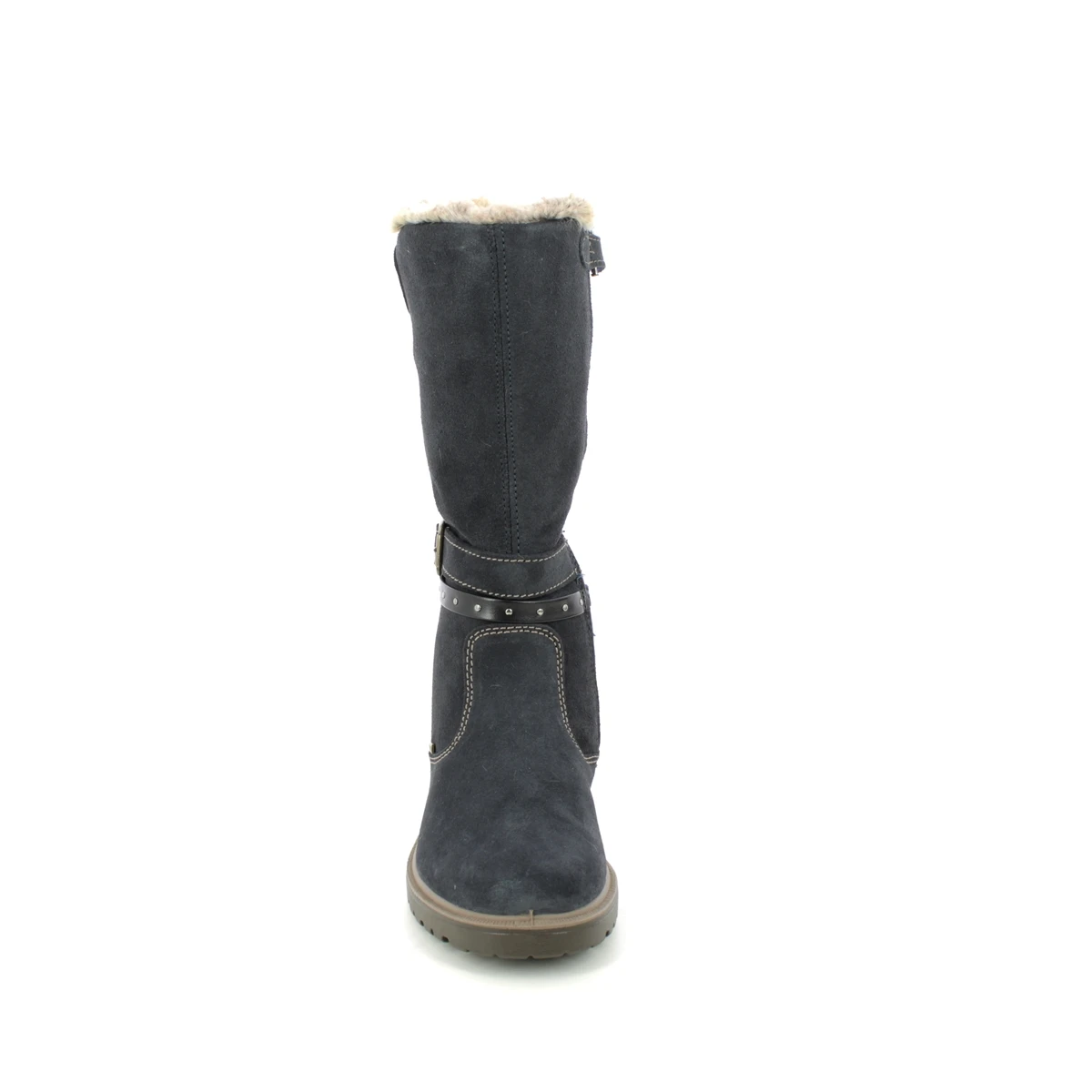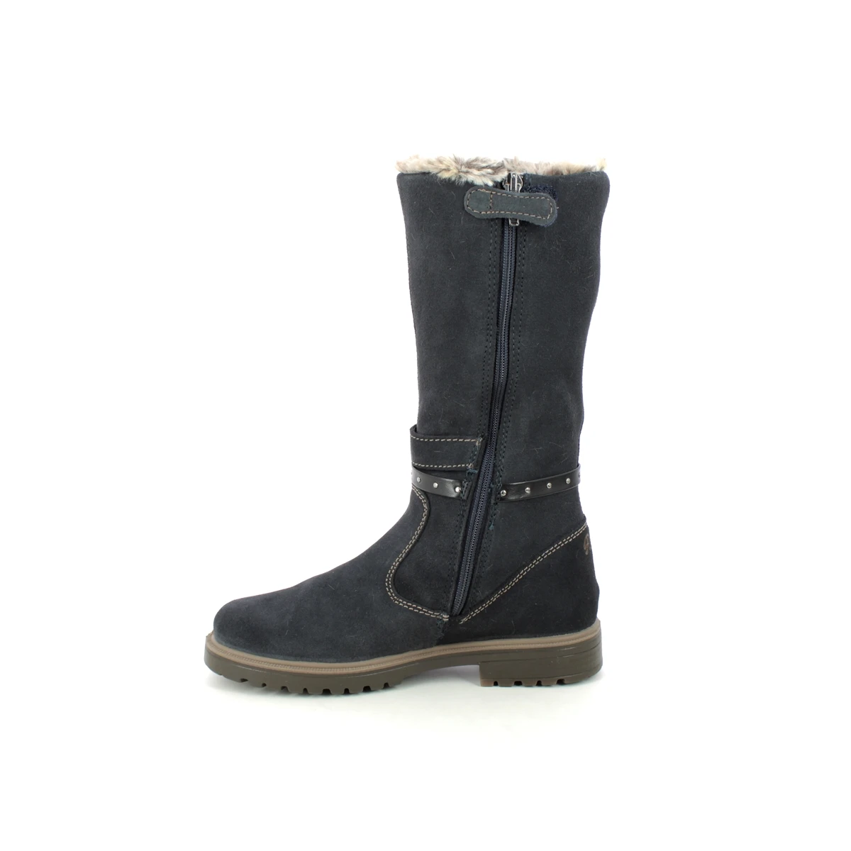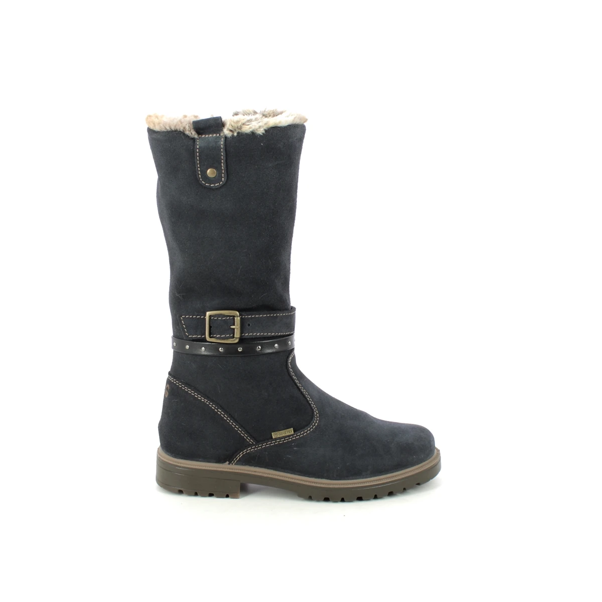 Primigi Chris Long Gtx girls navy boots are waterproof and warm. These girls navy long boots have a suede leather upper and a stylish buckle and strap detail around the ankle. The lining is a cosy faux fur whilst the Gore tex membrane ensures feet are kept dry, no matter the weather.