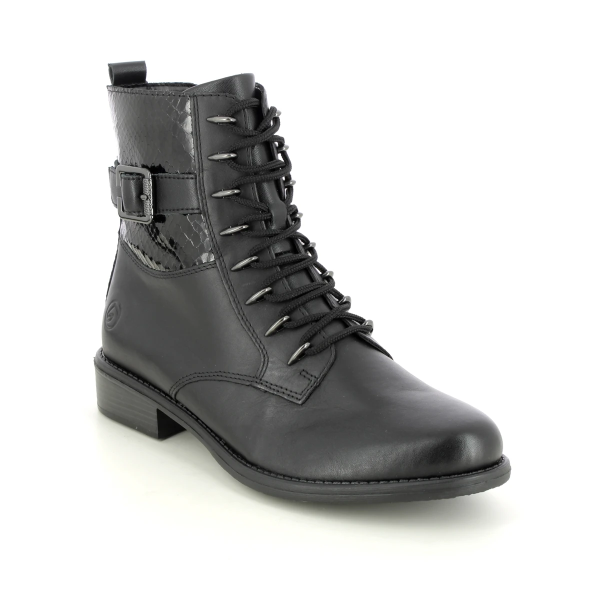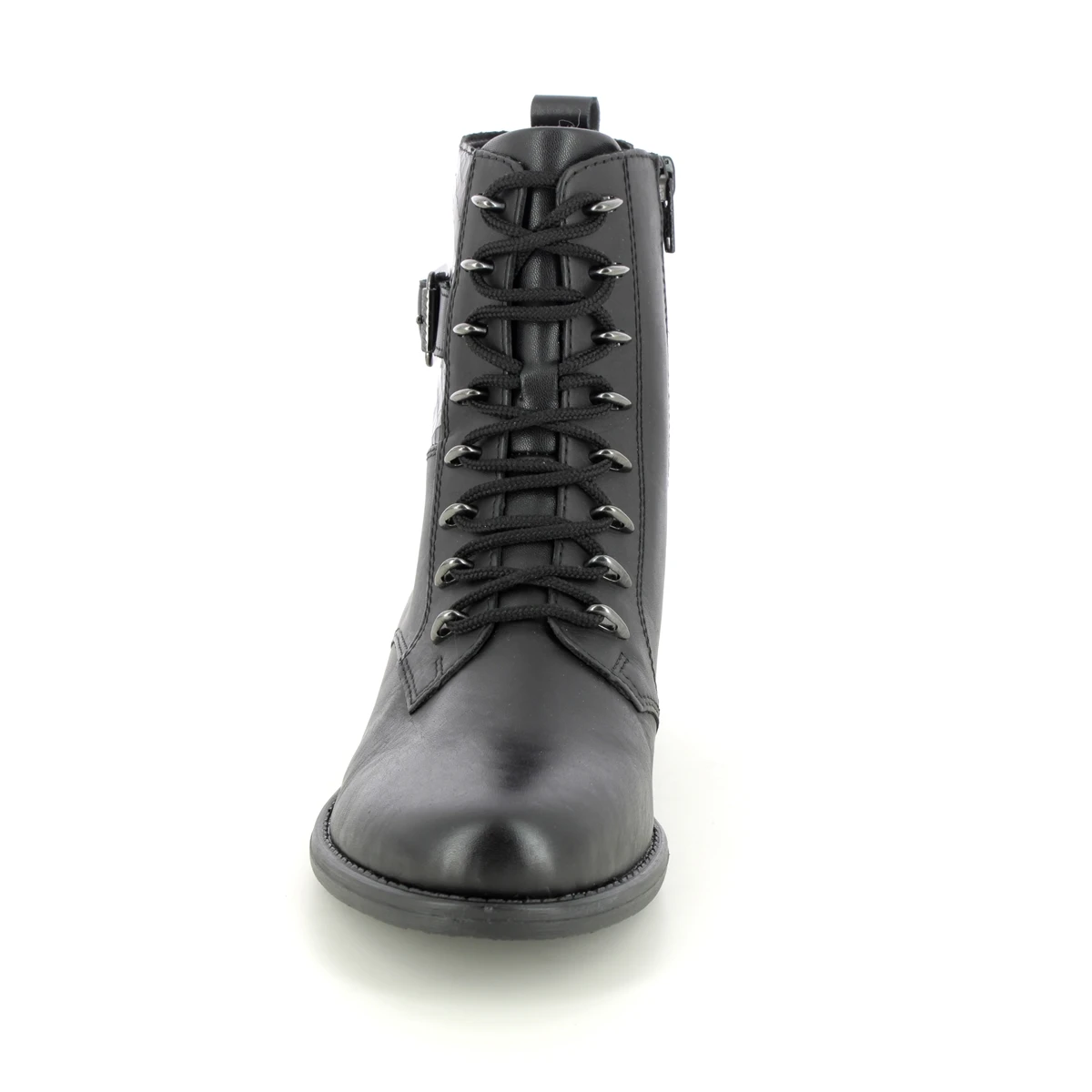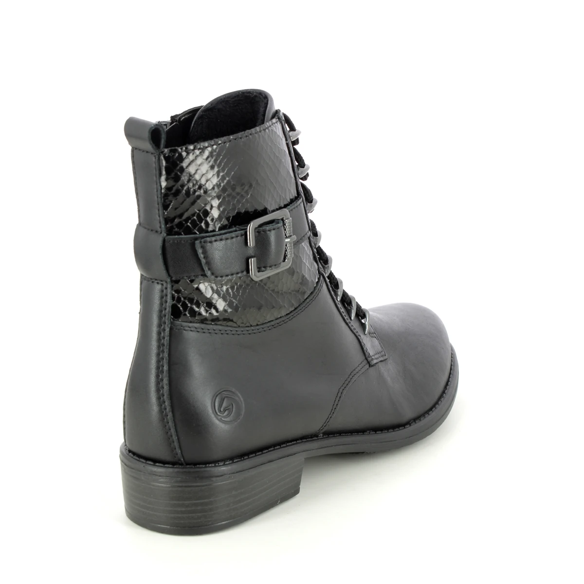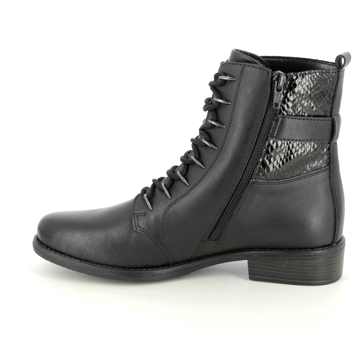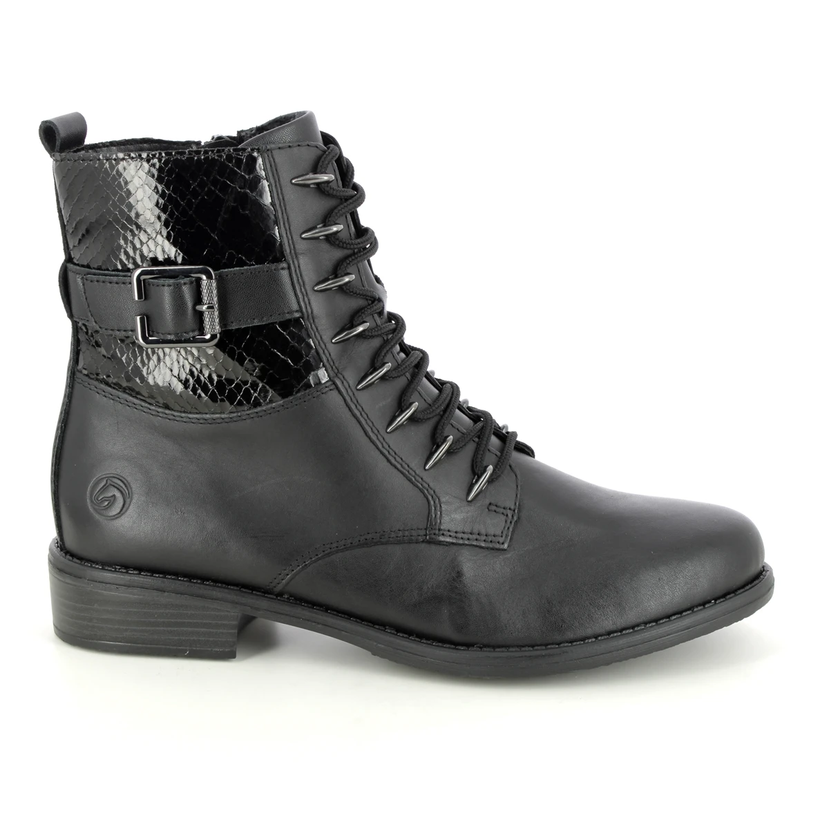 The Remonte Peechlace women’s black lacing boots are a wardrobe staple. These women’s black lace up boots have a smooth leather upper with snake texture on the side, with a buckle decal. The interior side zip allows easy foot entry whilst the removable insole offers a more personalised fit.