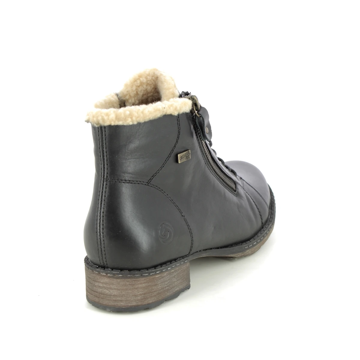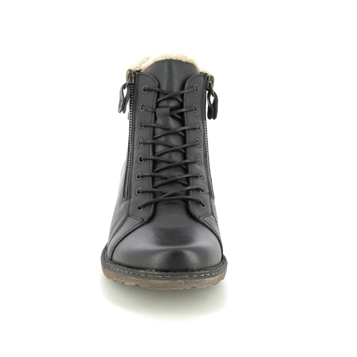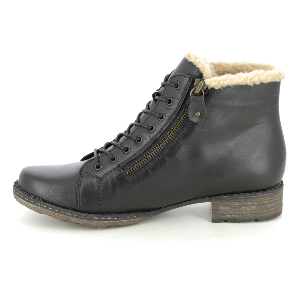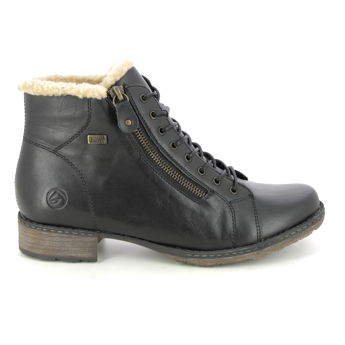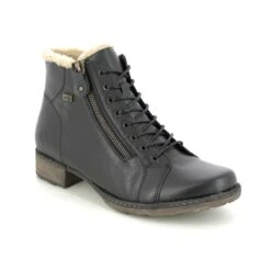 Remonte D4372-01 Peesienna Tex women’s black leather lacing boots are versatile and classy. These women’s ankle boots have a smooth leather upper with cosy off-white fleece trim. Pair with dresses, trousers and skirts alike for a superb comfy and versatile option.