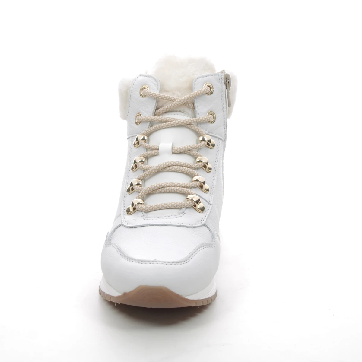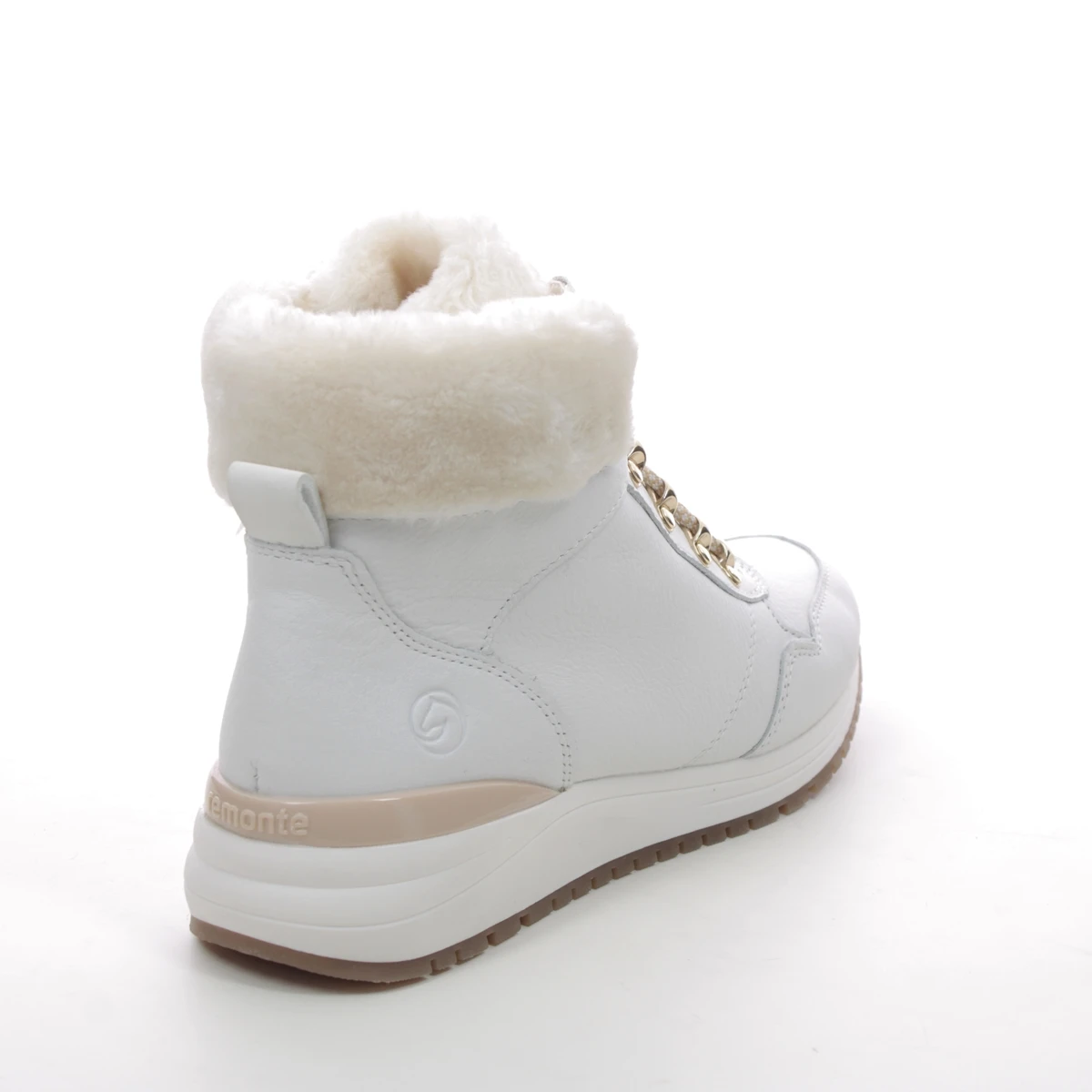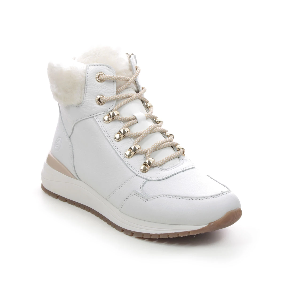 Remonte R3773-80 Valofur women’s white ankle boots offer cosy chalet chic. These women’s white winter boots feature a smooth leather upper with cosy faux fur trim and lining. The hiking style laces and gold metal hardware offer a luxury finish whilst the rubber outsole provides improved traction.
