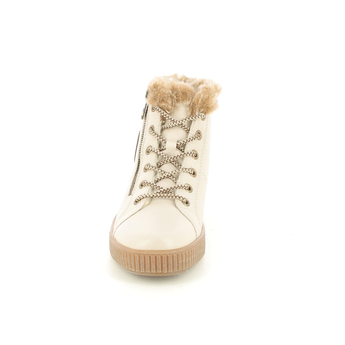 Enjoy winter in the chalet chic R7980-80 DURLOFUR TEX white leather ankle boots. Theyll have you ready for colder temperatures thanks to their sheepskin lining and Remonte Tex water resistant membrane. Fashion features include a faux fur ankle cuff and tough hiking inspired laces