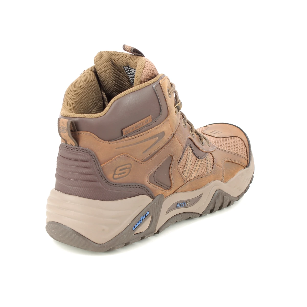 The Skechers 204406 Arch Fit Recon mens walking boots in desert brown leather have built in arch support. The sole unit is made from goodyear tyre rubber for extra traction whilst the padded collar ensures a snug and secure fit.