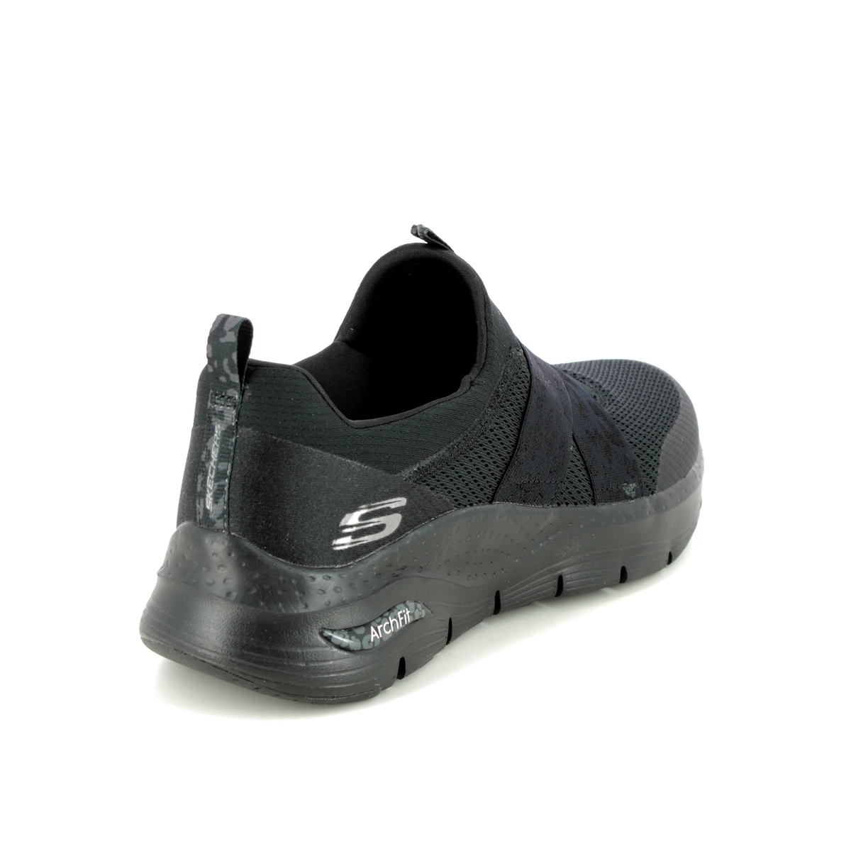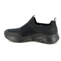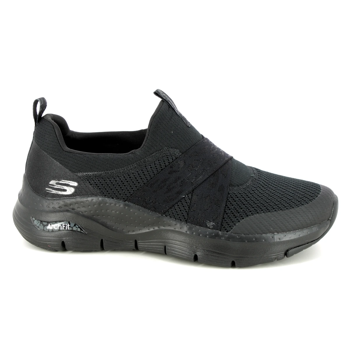 Skechers 149717 Arch Fit Slip On X Strap womens black slip on trainers have built-in arch support.