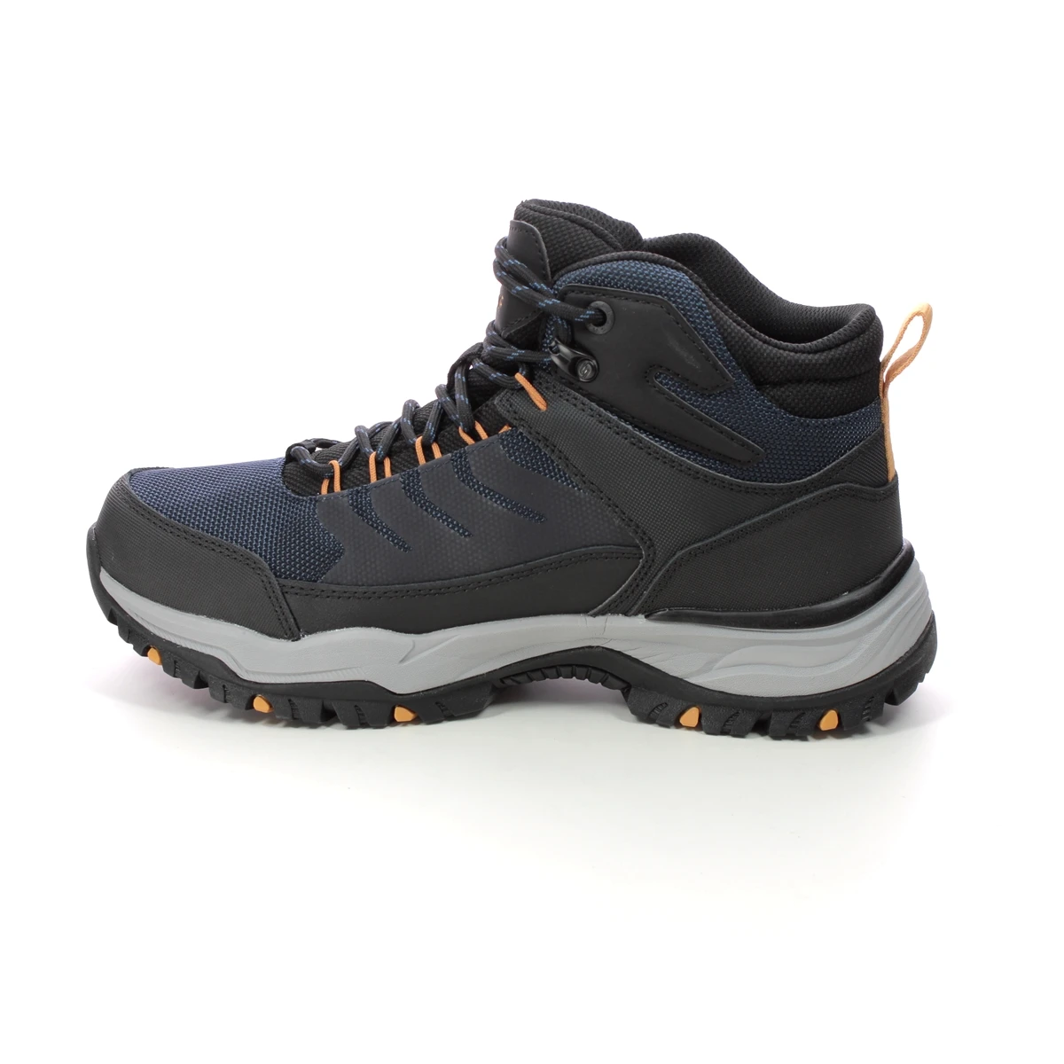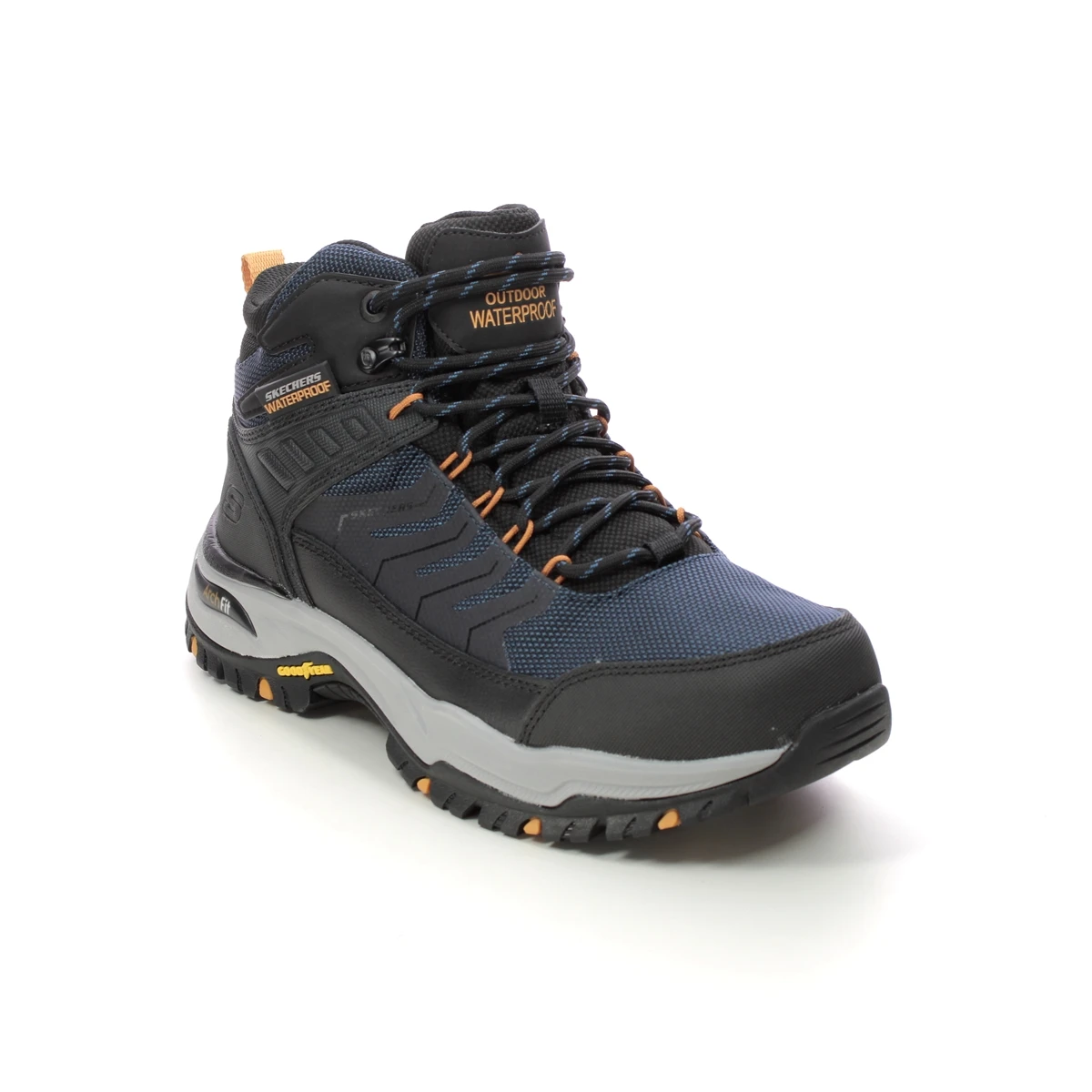 Skechers Arch Fit Tex Dawson Raveno men’s navy walking boots are waterproof and wide fitting. These men’s Skechers walking boots feature a navy and black leather and mesh textile upper with adjustable laces and a waterproof tex membrane to help keep feet dry. The Skechers Relaxed Fit design offers a wider fit, whilst the padded memory foam footbed features built-in arch support for improved comfort. The grooved outsole is made from Goodyear rubber, offering excellent traction on a variety of terrains.