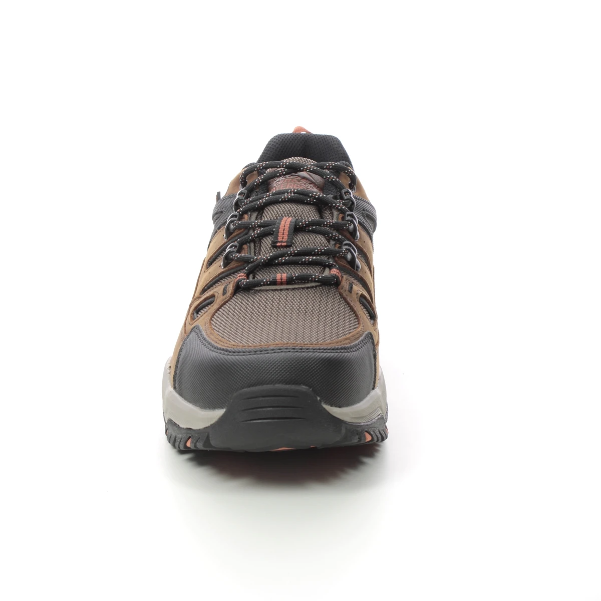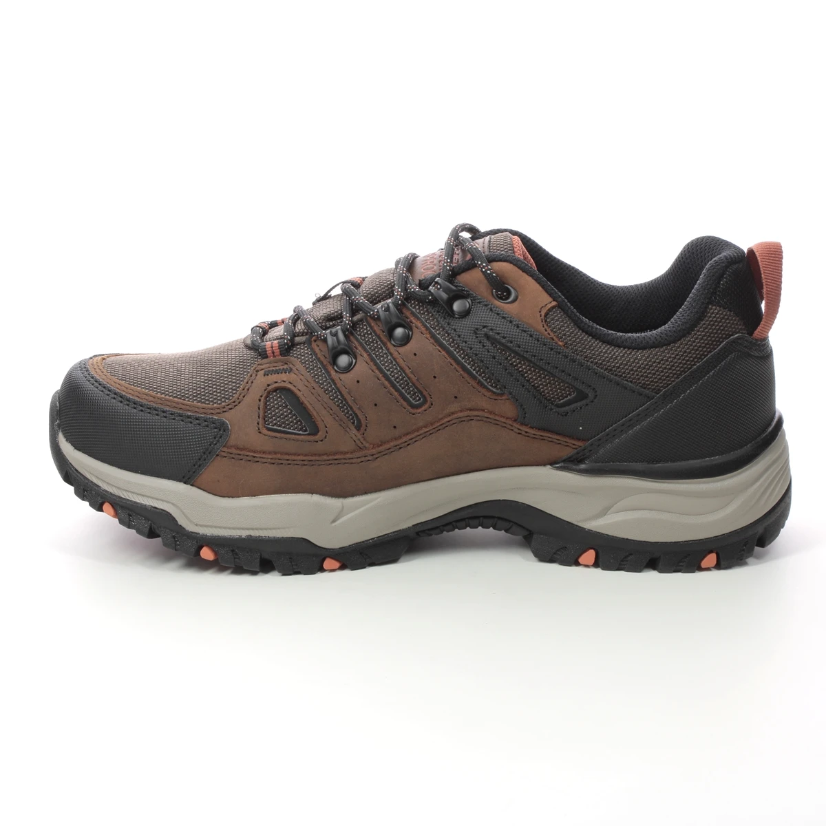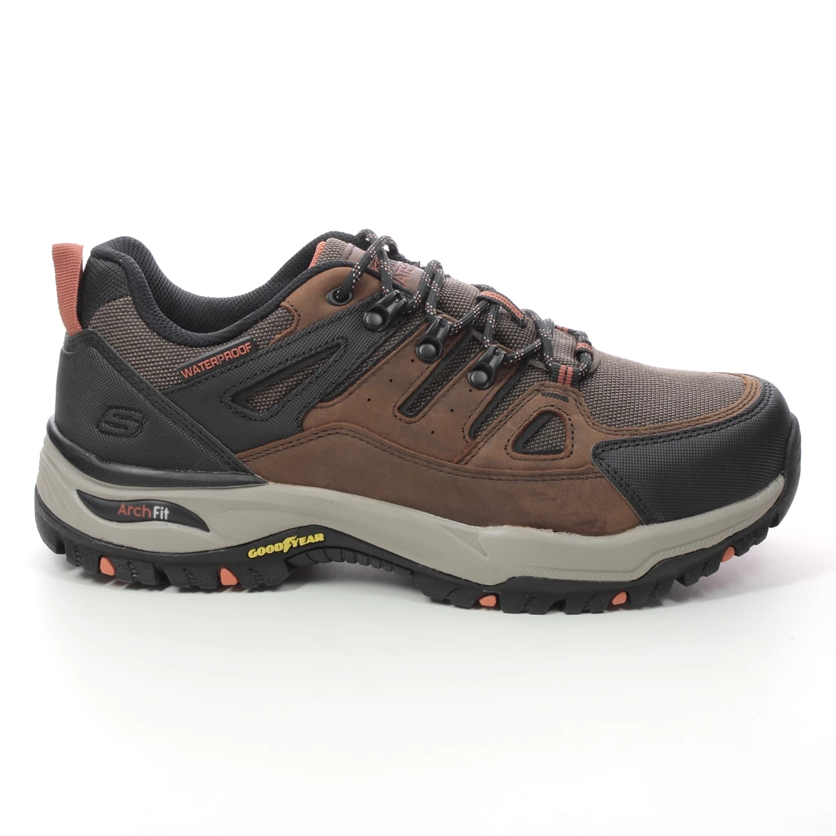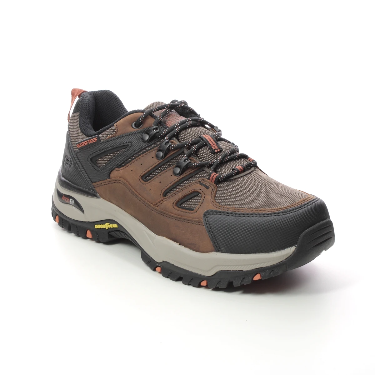 The Skechers Arch Fit Tex Dawson Vortego men’s waterproof Skechers in brown are ideal for outdoor adventures. These men’s Skechers walking shoes have a dark brown leather upper with man-made overlays and breathable textile panels. The rugged lace system offers an adjustable fastening whilst the memory foam footbed features arch fit for comfort and support underfoot. Skechers have used a waterproof membrane to ensure feet are kept dry, whilst the Goodyear Rubber sole features grooving for improved traction. Wide fitting and waterproof, these men’s walking shoes are the ideal companion for exploring the great outdoors.