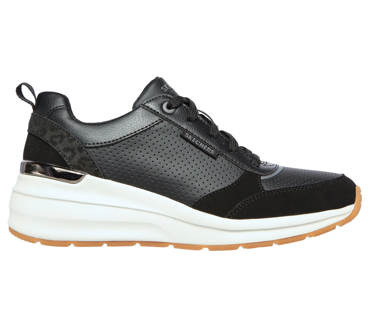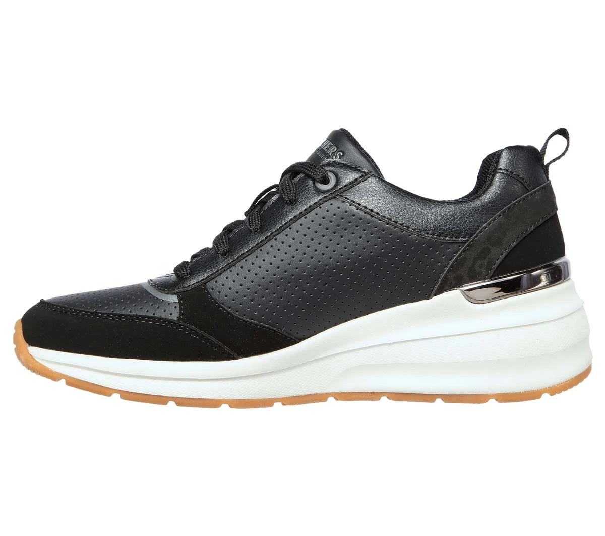 The Skechers Billions Wedge women’s black trainers are sporty and comfy. These women’s black wedge trainers have a smooth man-made upper with perforations for improved airflow. The Air Cooled memory foam footbed also helps to keep feet cool whilst the 50mm wedge heel adds extra height without compromising on comfort.