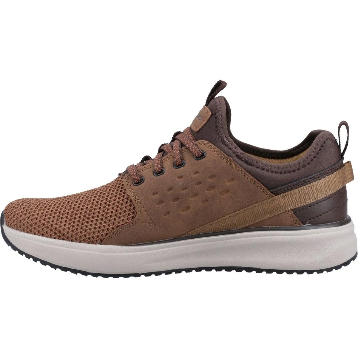 Skechers Crowder Colton men’s tan brown casual shoes are easy to wear. These men’s brown trainers have an elastic lace and padded neoprene collar with a memory foam footbed.