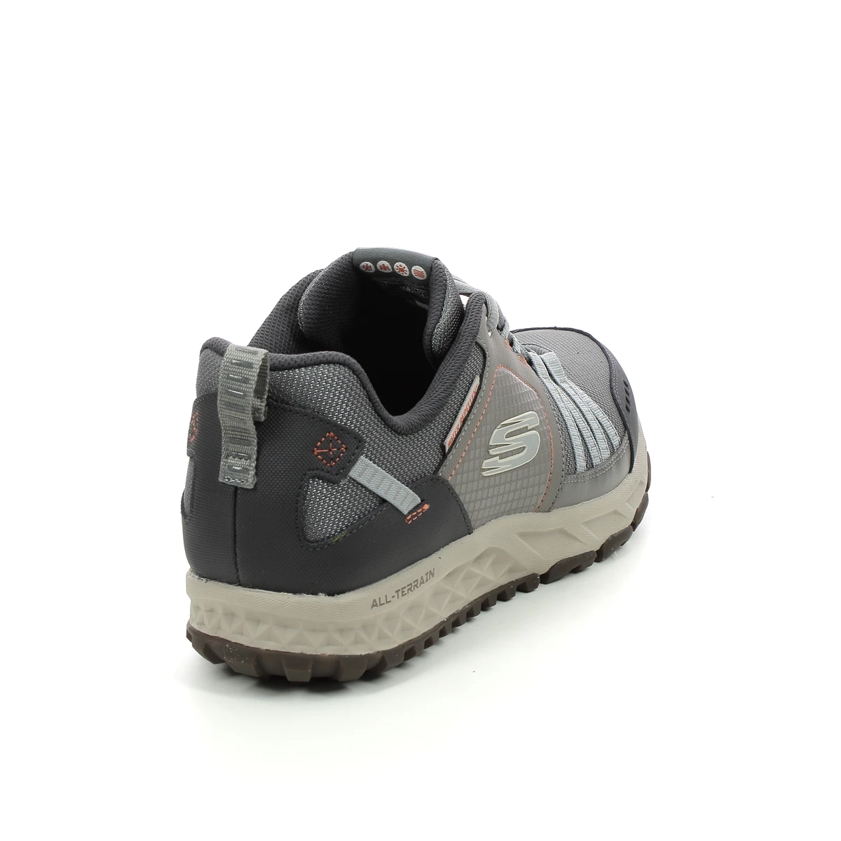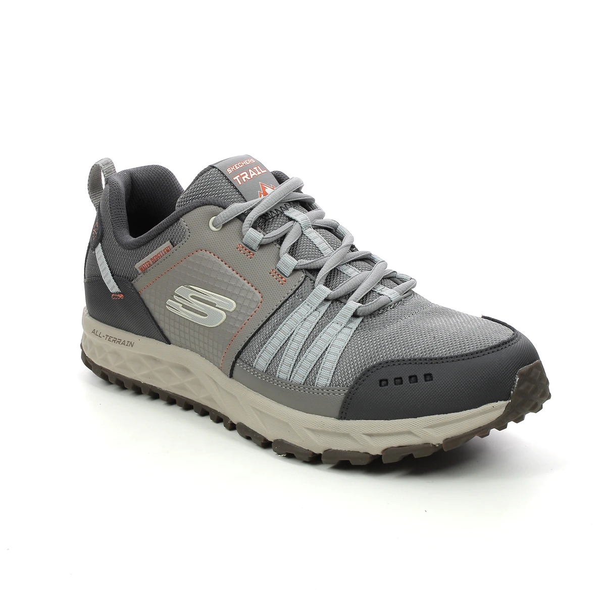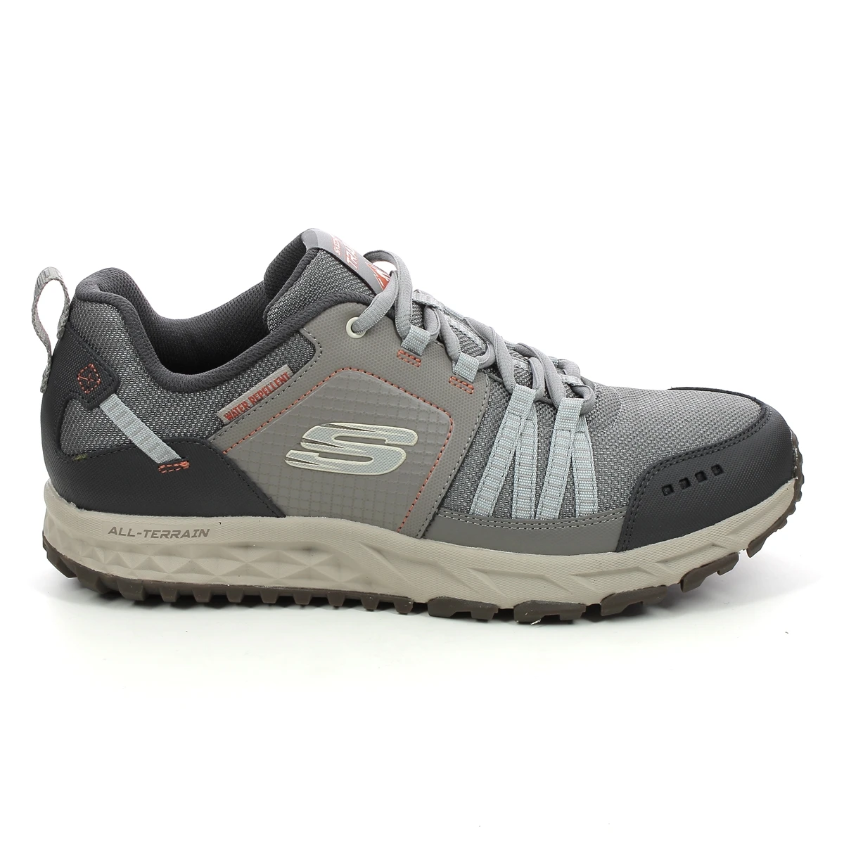 Skechers 51591 ESCAPE PLAN mens walking trainer combines practicality with stylish design The athletic style of the shoe is enhanced by the flexible high traction all terrain rubber outsole. The upper features mesh fabric panels at the sides toe and heel to allow for increased ventilation to the foot creating a cooling effect. The Air Cooled Memory Foam cushioned comfort insole padded collar and tongue and soft fabric shoe lining all ensure your comfort. There is a shock absorbing supportive midsole to increase your comfort while wearing. The built in heel measures approximately 1 inch. An added benefit is the Skechers Water Repellent lining – perfect for any outdoor activity
