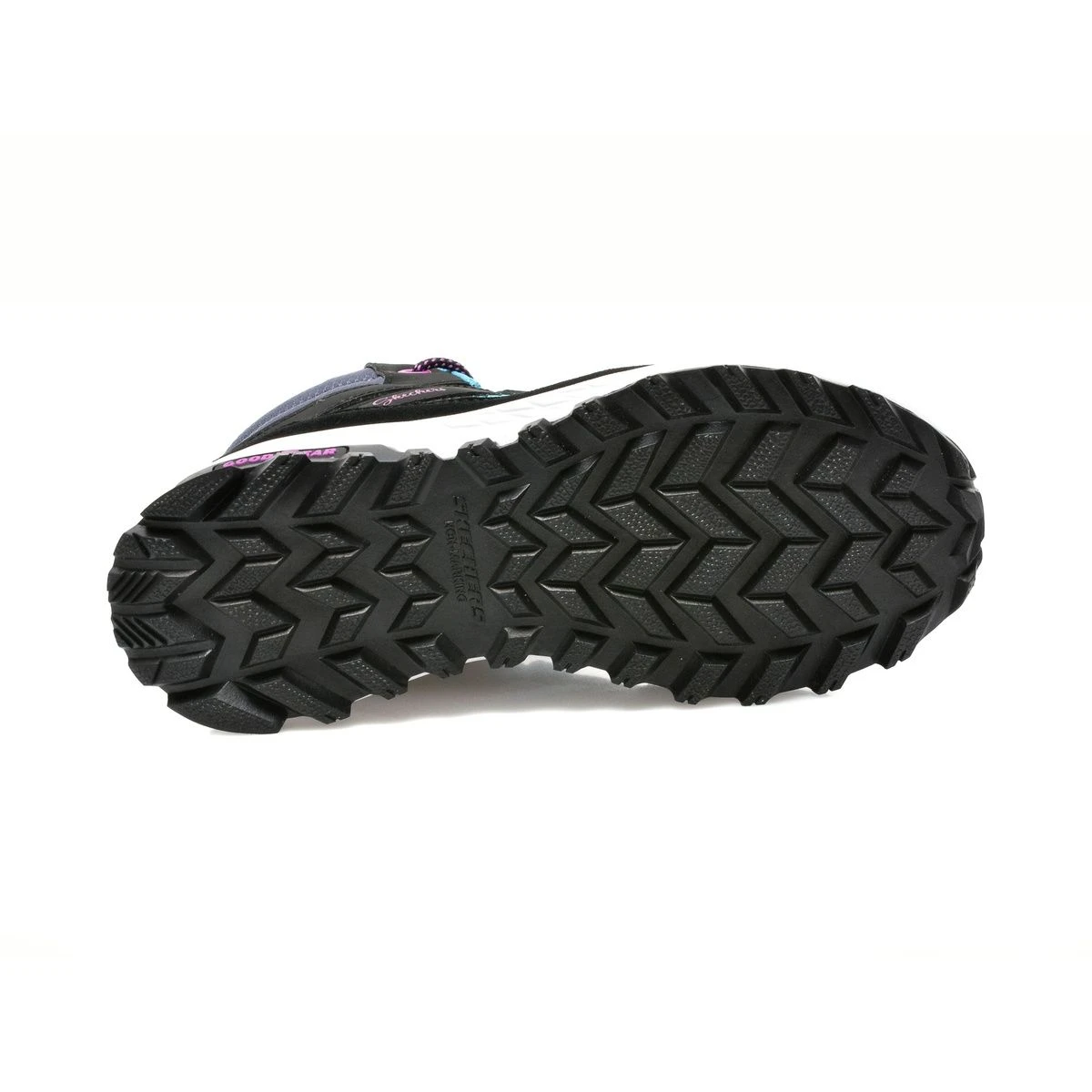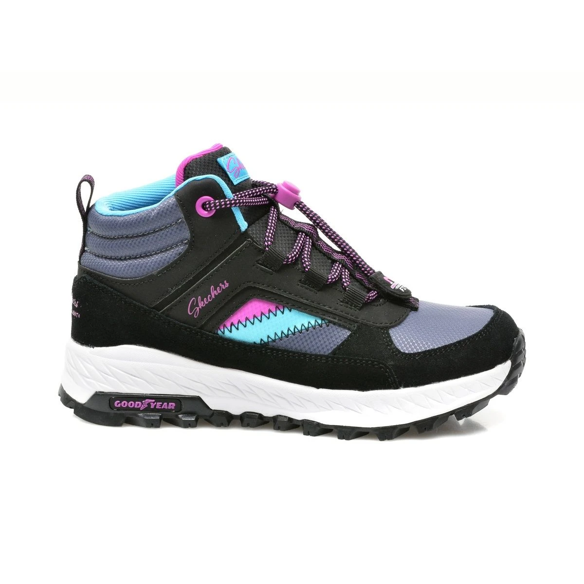 Skechers 302949L FUSE TREAD Girls boots are stylish and warm. These girls Skechers boots have a black suede effect upper with mesh fabric panels on the toe sides and cuff in purple blue and pink. The bungee lace up front can be adjusted using the toggle for a secure and quick fastening whilst the padded collar offers a snug fit around her ankle. The cushioned footbed ensures superb comfort underfoot whilst the Goodyear rubber outsole is grooved for improved traction.