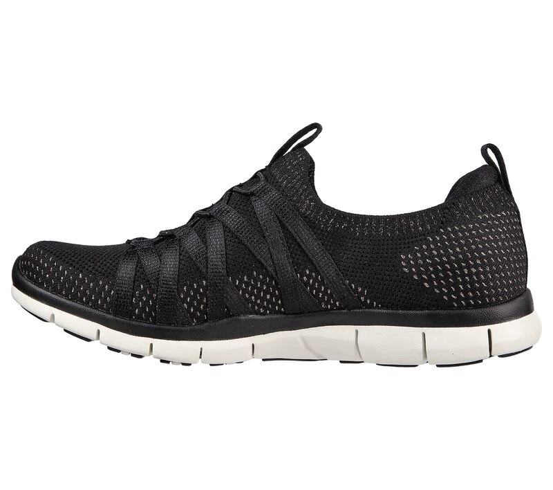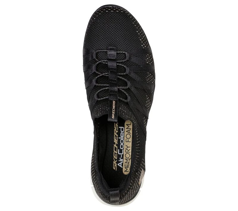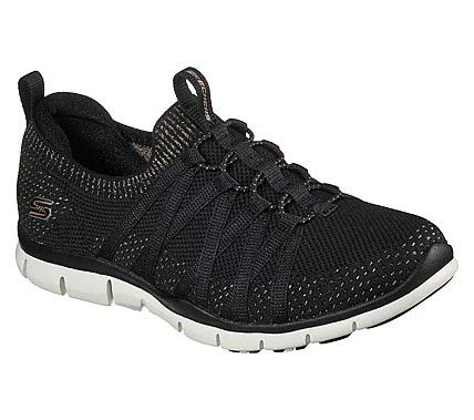 Skechers 104157 GRATIS womens trainers are sporty and comfy. These slip-on Skechers have a black knitted mesh fabric upper with rose gold glitter for added sparkle. Overlay panels on the sides and laces offer additional support whilst the bungee lace provides a comfy slip-on fit. There is a padded collar and reinforced heel covering for a snug whilst the Air Cooled memory foam footbed offers immediate comfort underfoot. The Vegan Skechers are made entirely from high quality man-made materials whilst the lightweight sole unit is flexible and responsive.