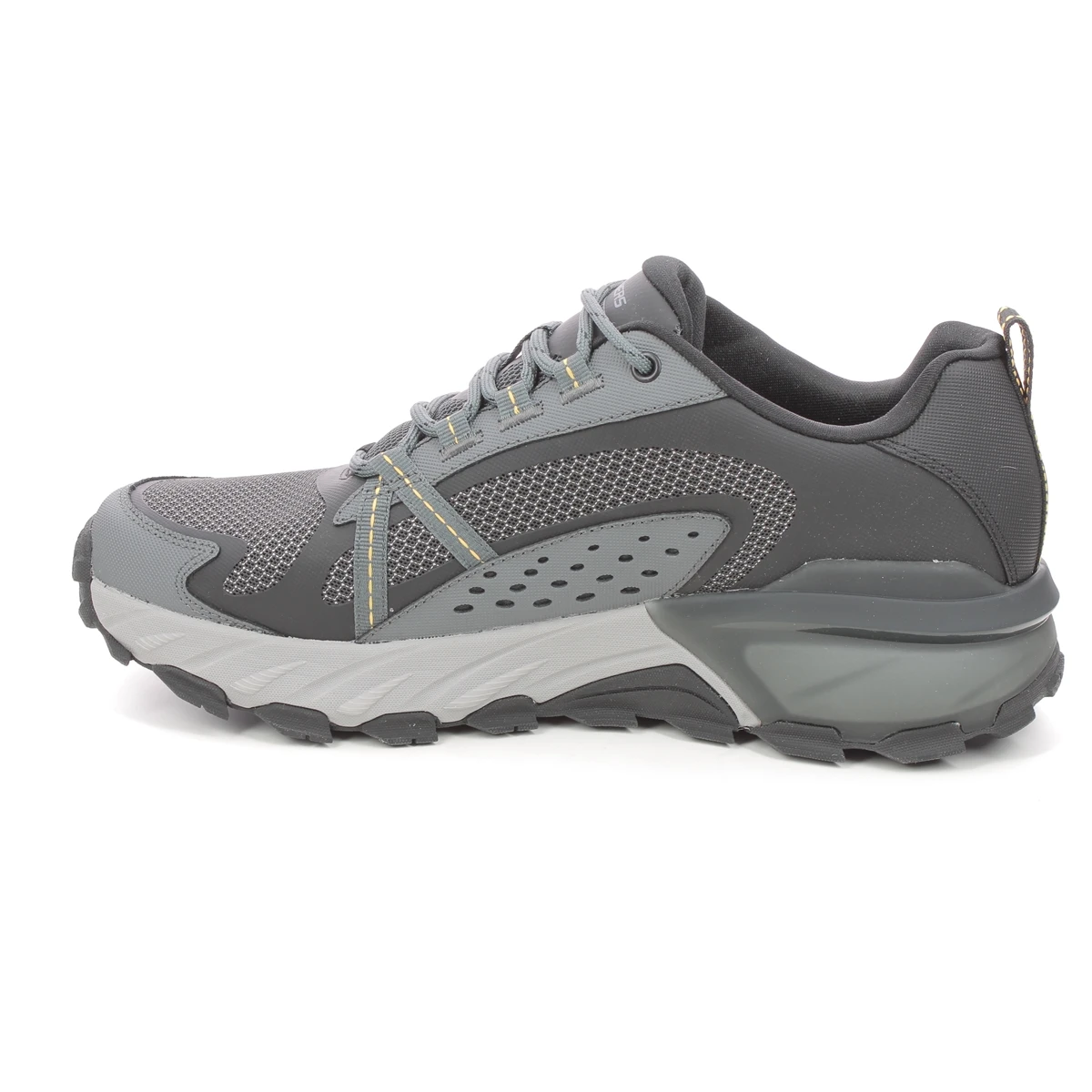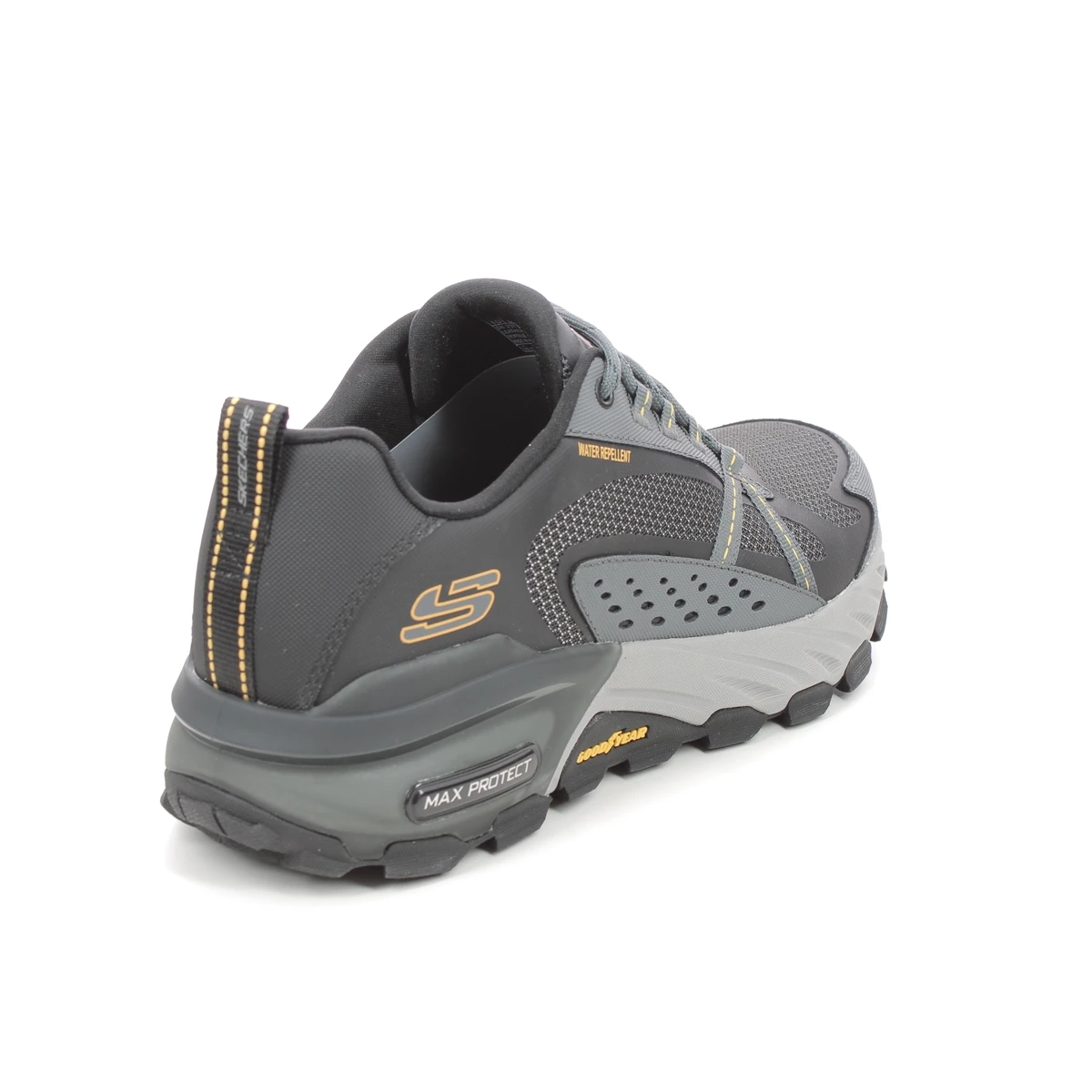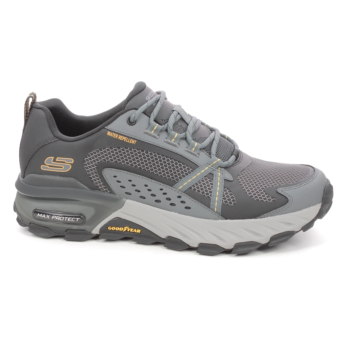 The Skechers 237303 Max Protect mens black charcoal walking shoes are water repellent with a Goodyear tyre rubber outsole for extra traction.