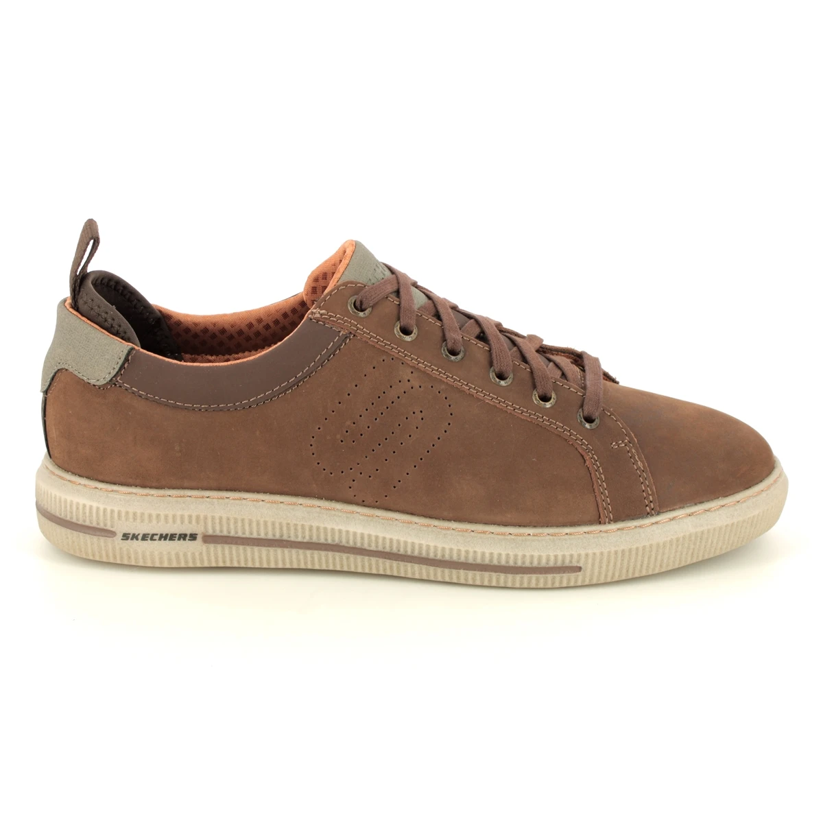 Skechers Pertola Ruston mens casual shoes in chocolate brown have a padded heel back with a cushioned footbed.