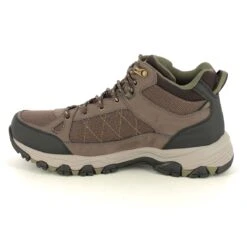 The Skechers 204477 Selmen Melano Tex mens chocolate brown outdoor walking boots are wide fit and waterproof with rugged laces and a sturdy sole unit.
