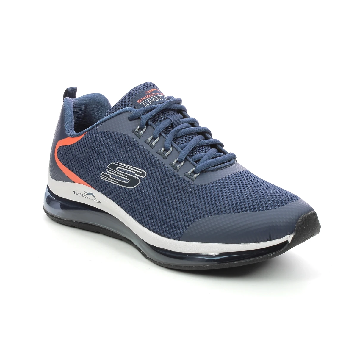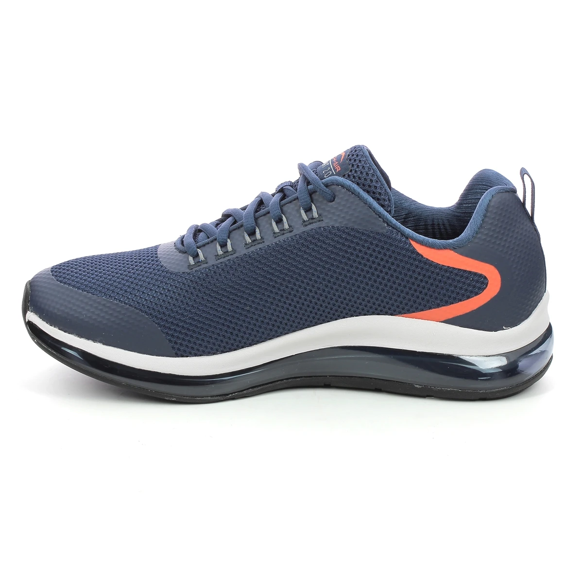 Skechers 232036 Skech Air 2 Mens navy trainers are sporty and stylish. These mens memory foam Skechers have a navy mesh fabric upper with man-made overlays on the toe heel and laces. The full lace up front ensures an adjsutable fastening whilst the padded collar and tongue offers a snug fit. There is an air cooled memory foam for superb comfort and a Skech-Air lightweight midsole which is also shock absorbent.