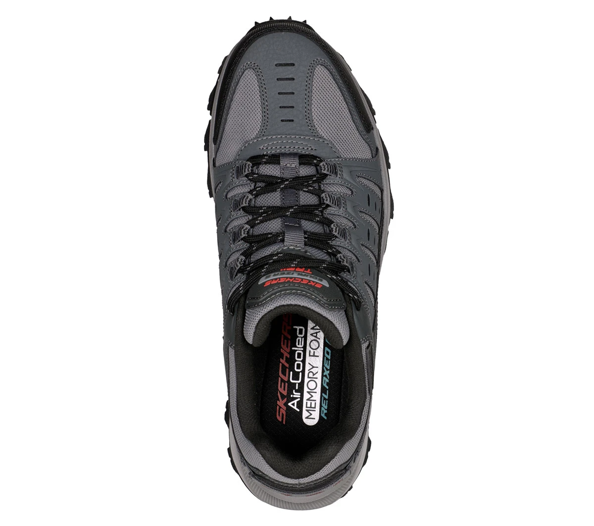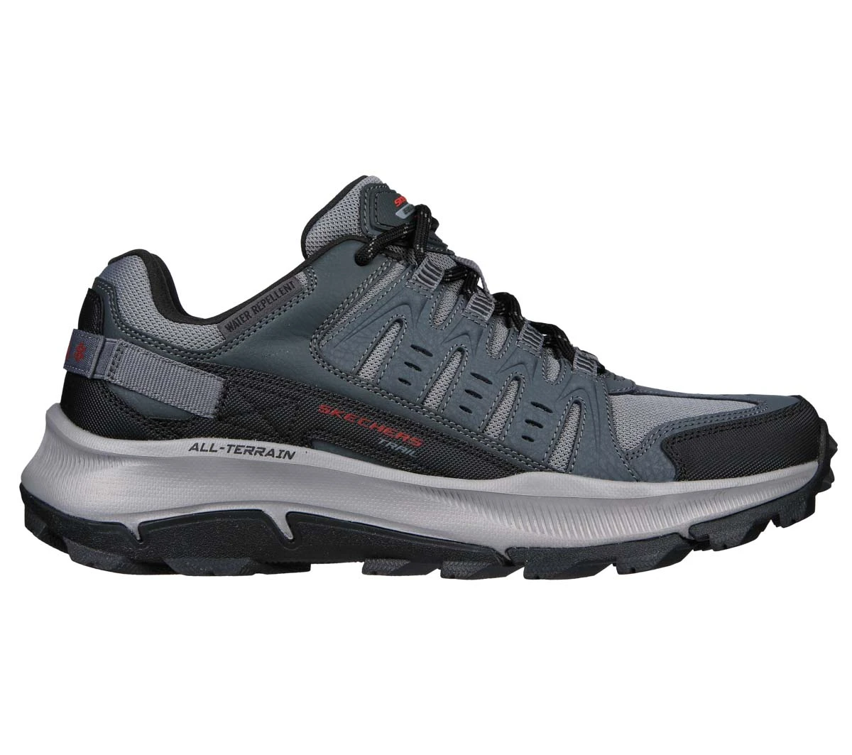 The Skechers Solix Trail men’s grey walking shoes are versatile and practical. These men’s Skechers walking shoes have a multi-layered upper of leather and man-made materials, with a full lacing system. The padded lining and Air Cooled Memory Foam footbed ensures superb comfort, whilst the rugged traction outsole features a multi-directional tread for excellent grip. Water resistant and comfy, these men’s grey walking shoes are a staple for exploring the outdoors.
