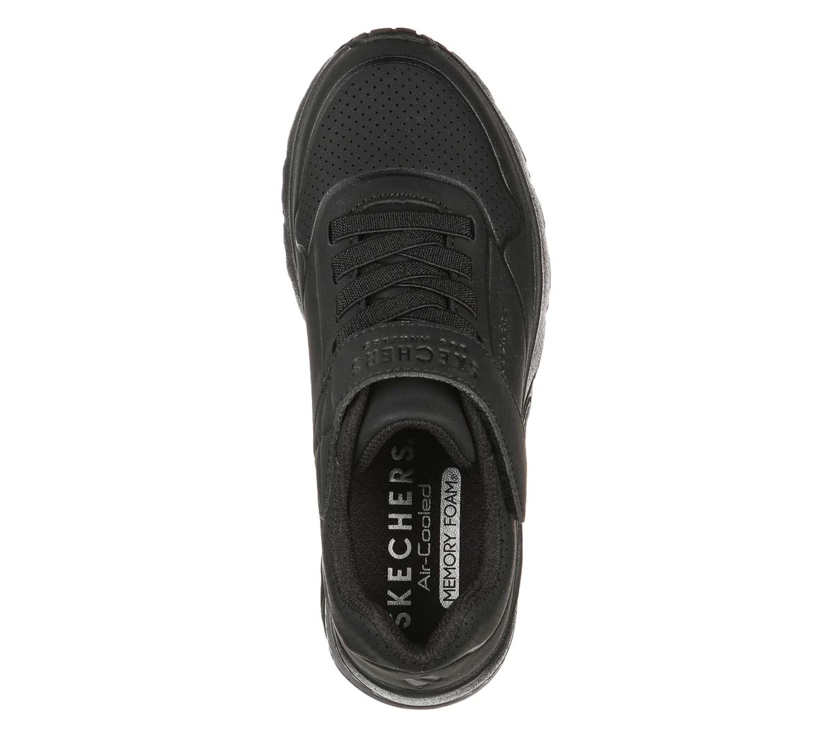 The Skechers Uno Lite Vendox boys black trainers are comfortable and easy to wear. These boys all black trainers have a bungee lace and Velcro strap for easy slip on fit and fasten. Ideal for school, these black Skechers are machine washable making them easy to clean.