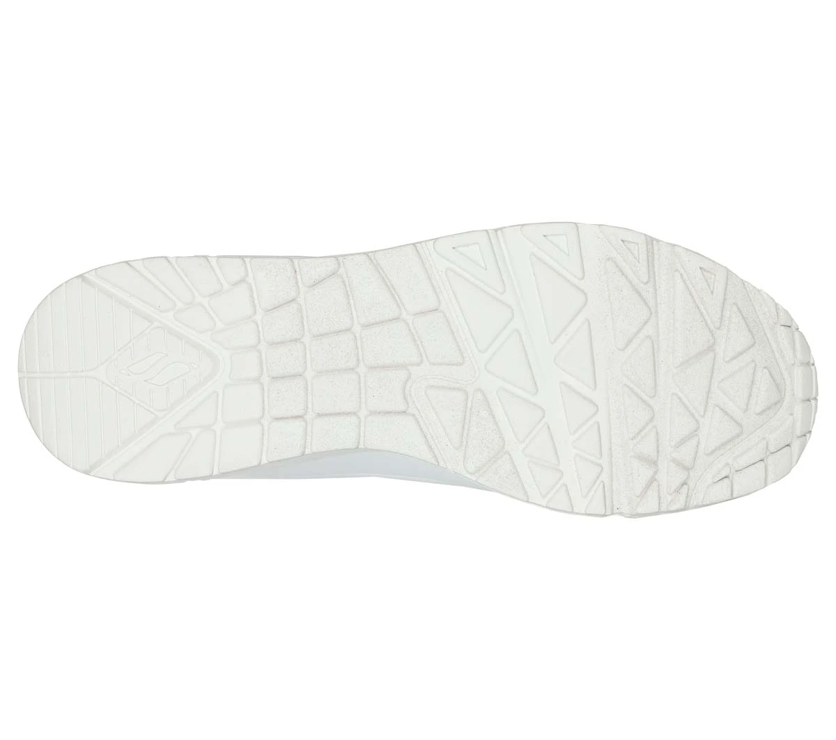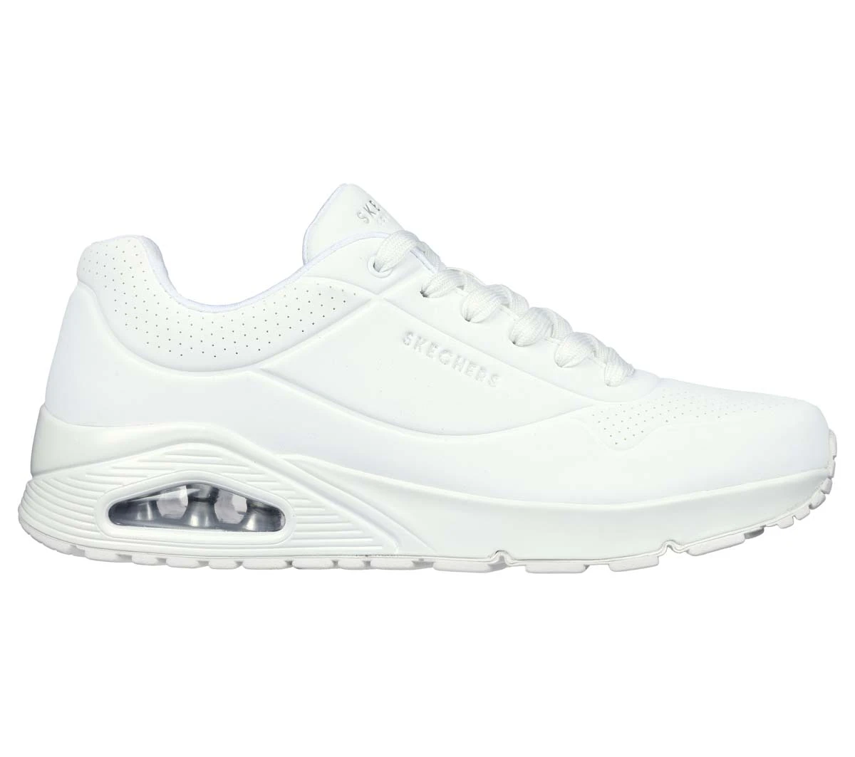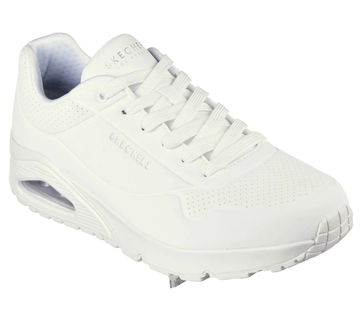 The Skechers Uno Mens white trainers are sporty and comfortable. These men’s all white trainers have a smooth man-made upper with perforations over the toe and ankle for increased flexibility and breathability. The lace up front ensures a secure and adjustable fastening whilst the visible air chamber in the sole unit offers comfort underfoot.
