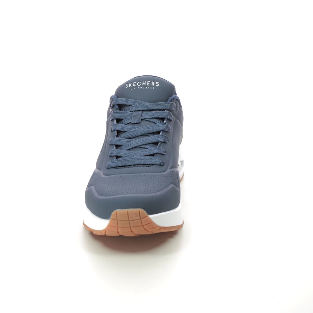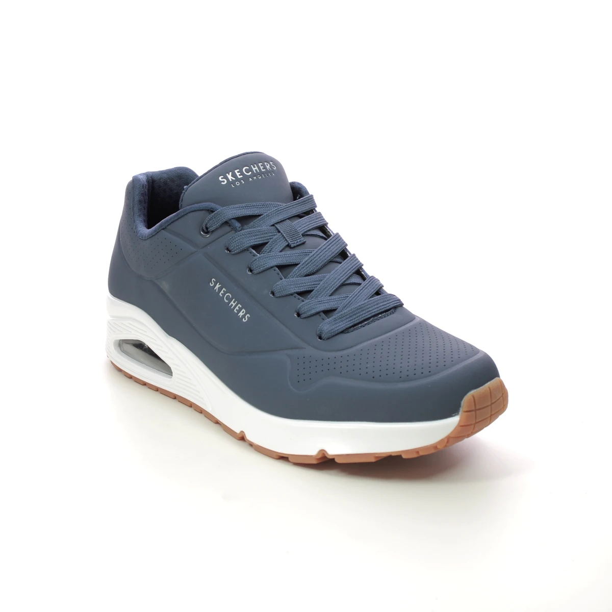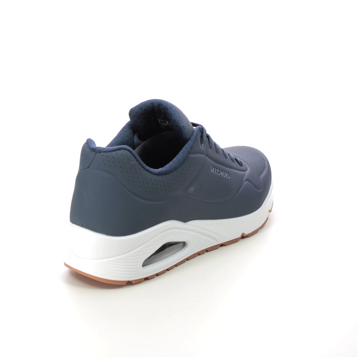 The Skechers Uno Mens navy trainers are sporty and versatile. These men’s navy Skechers have an Air Cooled Memory foam footbed, breathable textile lining and smooth man-made upper. Adjustable laces offer a secure fastening whilst the visible air chamber offers a bouncier step underfoot.
