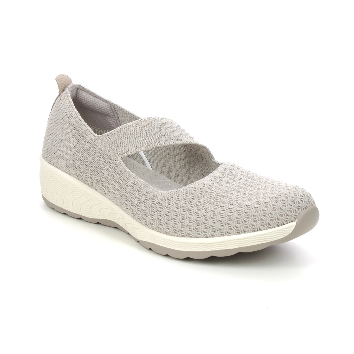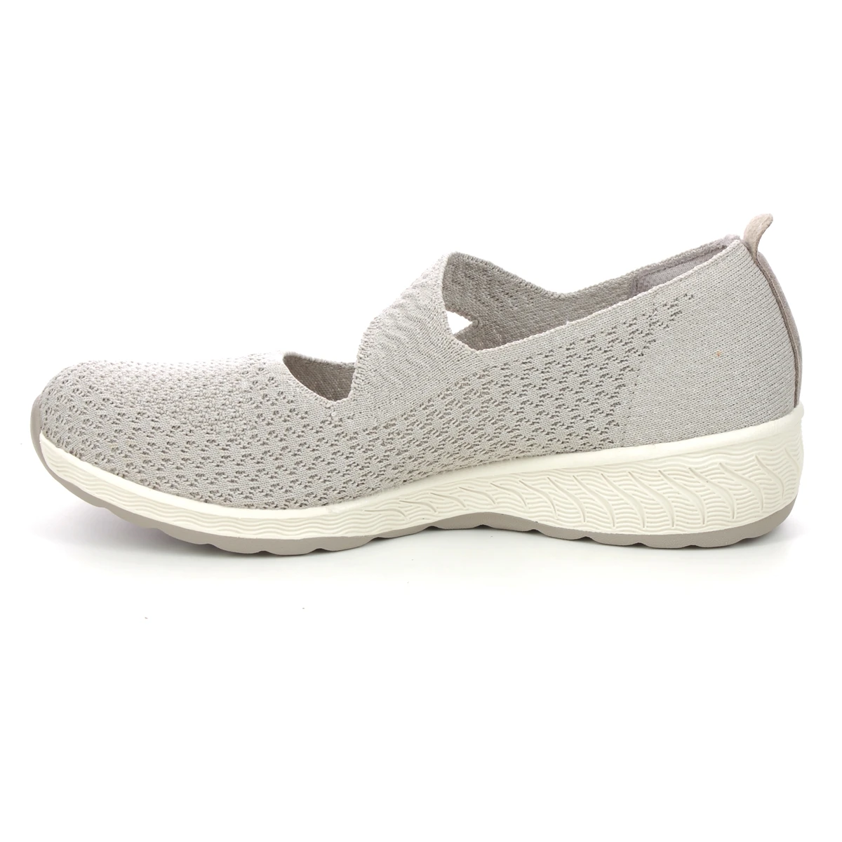 The Skechers Up Lifted Relaxed Fit women’s taupe Mary Jane shoes are machine washable and wide fitting. These women’s Vegan Skechers have a stretchy knitted textile upper with an elastic strap over the vamp and padded heel. There is a rubber outsole for additional traction, whilst the Skechers Relaxed Fit design makes them wide fitting.