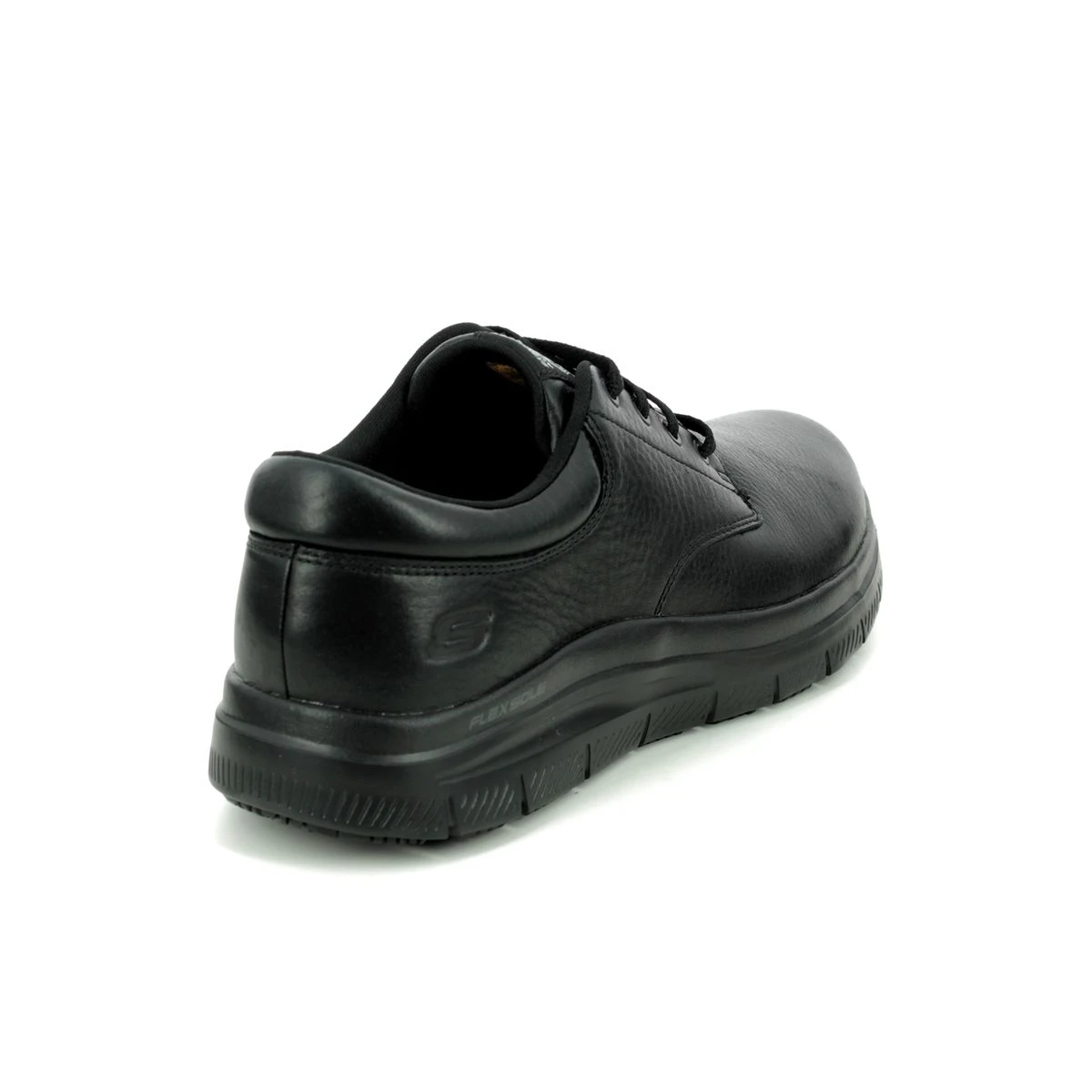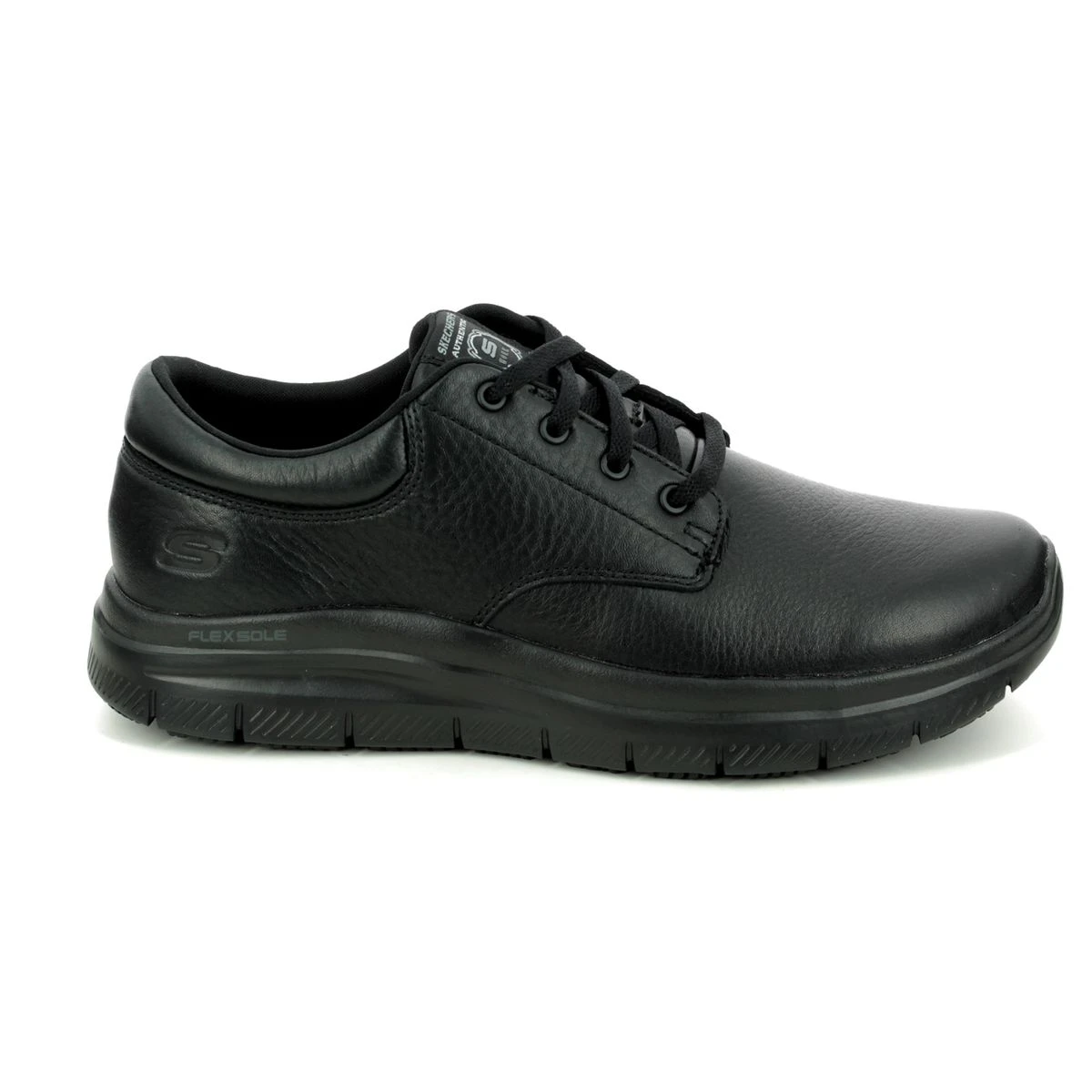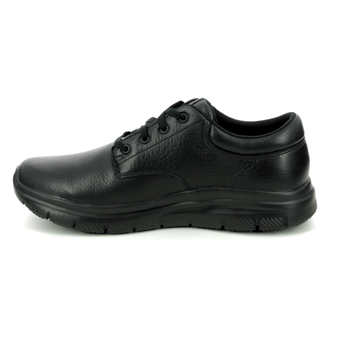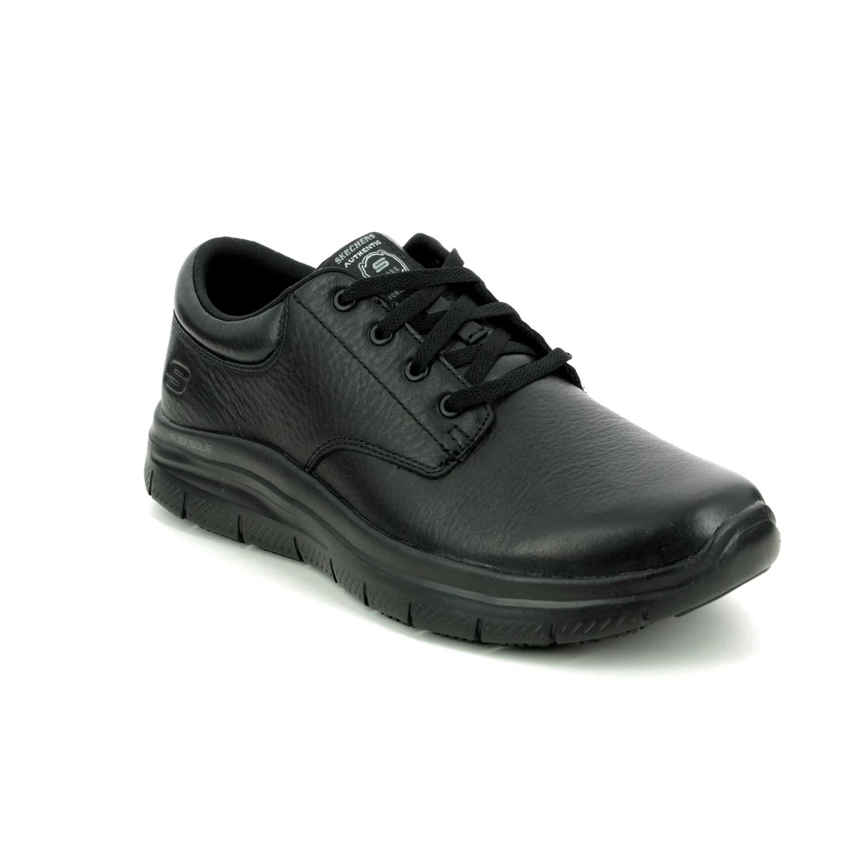 - Not Steel ToeSkechers Flex Advantage Fourche Slip Resistant 77513EC mens black smart lace up casual work shoes are the perfect choice for when you need both style and comfort. These lace up shoes have a smooth leather and synthetic upper and are perfect for work as not only do they have a slip resistant traction outsole but they have a Electral Hazard EH Safe design and conform to EN ISO 20347: 2012; OB FO SRC standards. The fabric lining creates breathability. The Relaxed Fit design provides a comfortable fit while the Memory Foam moulds to the foot and the FlexSole midsole is lightweight and shock absorbent. This smart and comfy mens black lace up work shoe is great for all day comfort