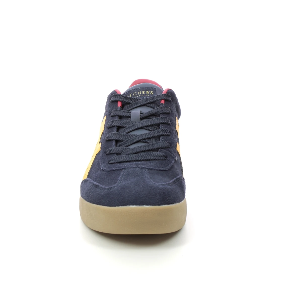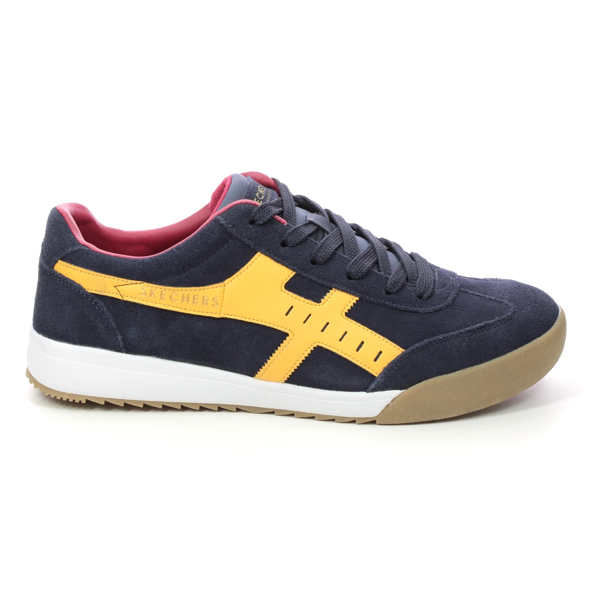 Skechers Zinger Manchego men’s navy yellow trainers are sporty and eye catching. The men’s navy Skechers have a soft suede upper with a bright yellow man-made overlay on the side. The red lining contrasts with upper and the full laces ensure a secure and adjustable fastening. The Air Cooled memory foam footbed ensures comfort underfoot whilst the rubber overlay on the outsole and toe bumper offers improved traction.