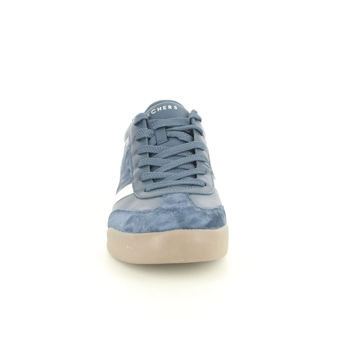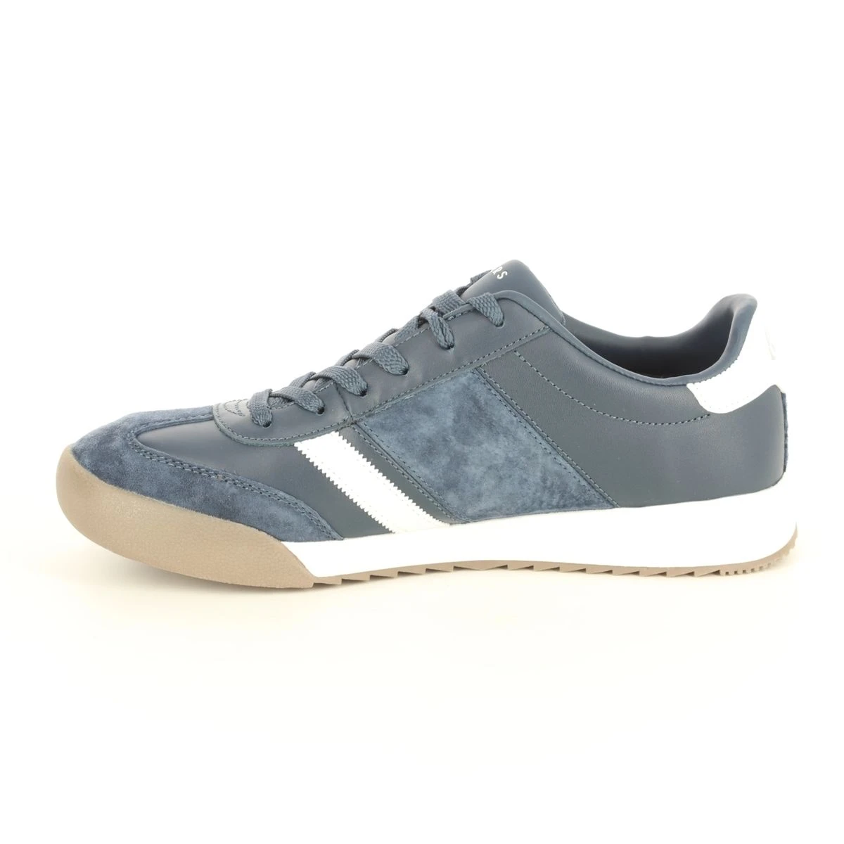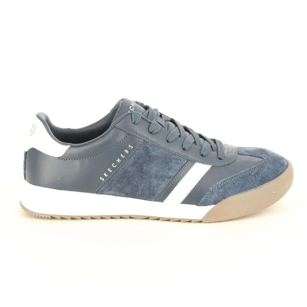 Skechers 52322 Zinger Scobie mens navy and white trainers are sporty. The mens navy Skechers trainer has a smooth leather upper with suede overlays for a contemporary multi finish effect. White leather overlays at the heel back and diagonal stripe match the small Skechers logo on the tongue and sides whilst the matching white midsole keeps this style looking sporty. The mens navy lacing trainer has a full lace up front with padded collar and tongue for your comfort. An Air Cooled Memory Foam insole offers superior underfoot comfort.