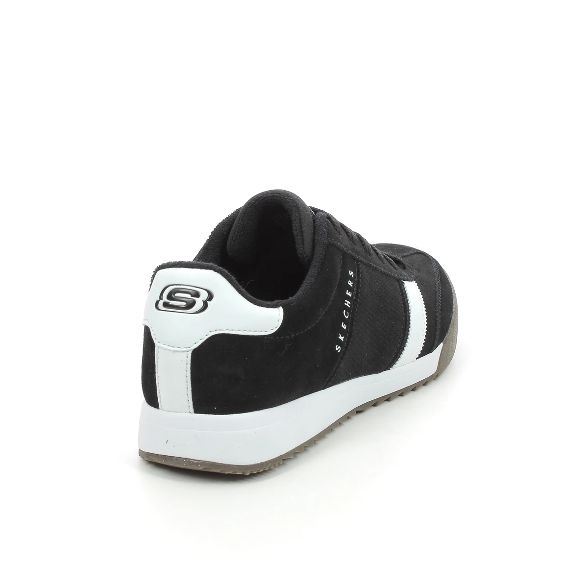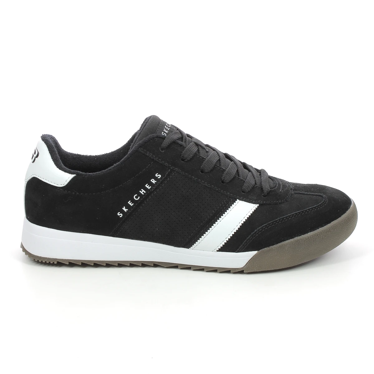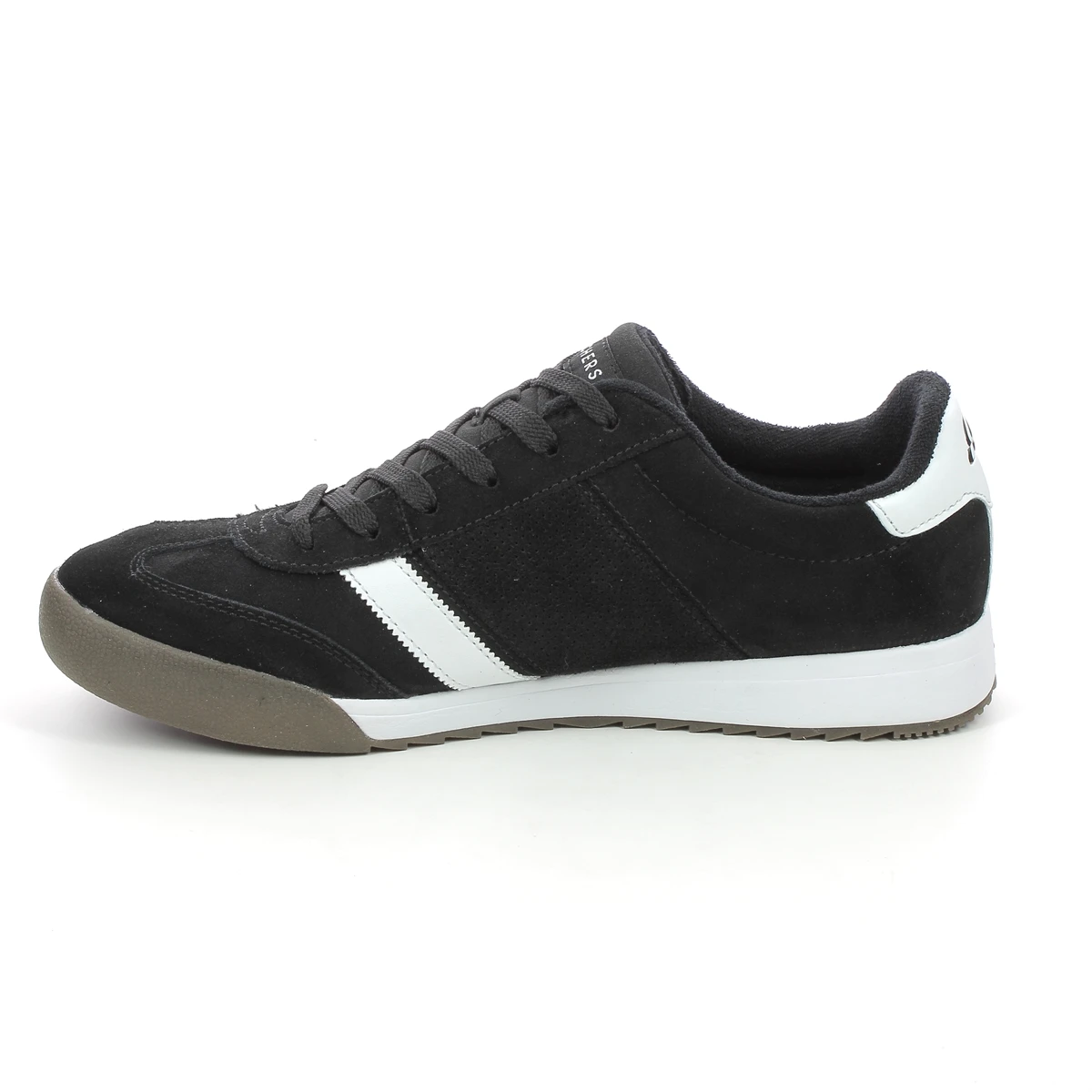 The Skechers 52328 ZINGER VENTICH are a sporty casual addition to our huge Skechers trainers collection. The Adidas style trainers feature a black suede effect upper with contrasting white details in the diagonal stripe heel back and bright white mid sole. The lace up front offers a secure and adjustable fastening whilst padding around the collar and tongue ensure a snug fit. The rubber sole unit features a distinctive tread and a rubber toe bumper for improved grip