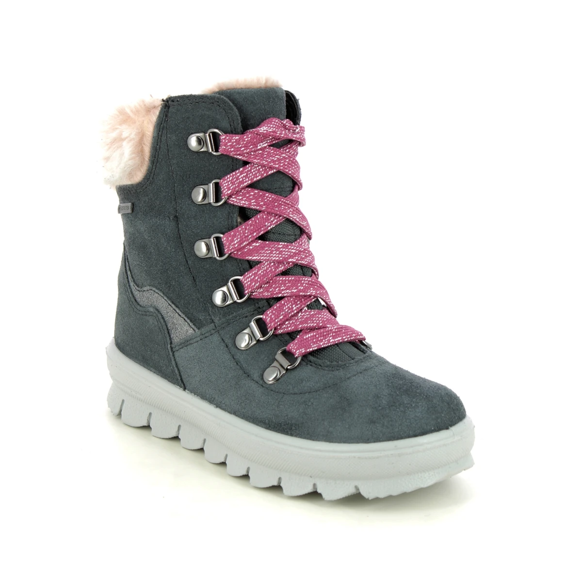 Superfit Flavia Lace Gtx girls grey boots are functional and waterproof. These infant girls boots have a suede leather upper with contrasting pink laces and a faux fur trim and lining. The interior side zip allows easy foot entry whilst the contrasting white outsole is grooved for improved grip.
