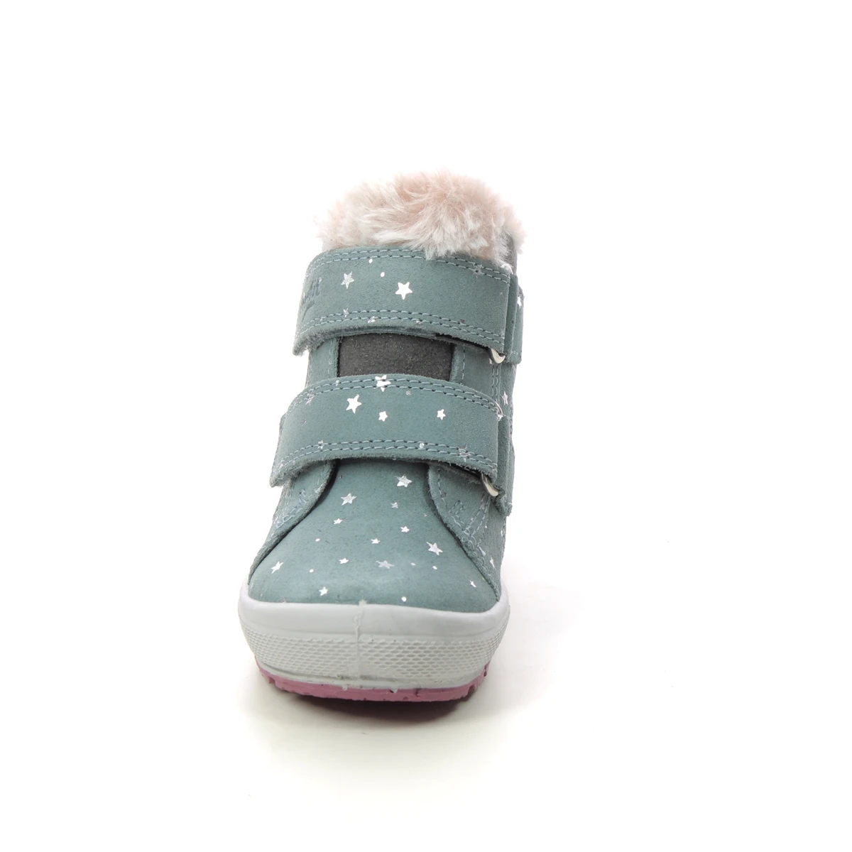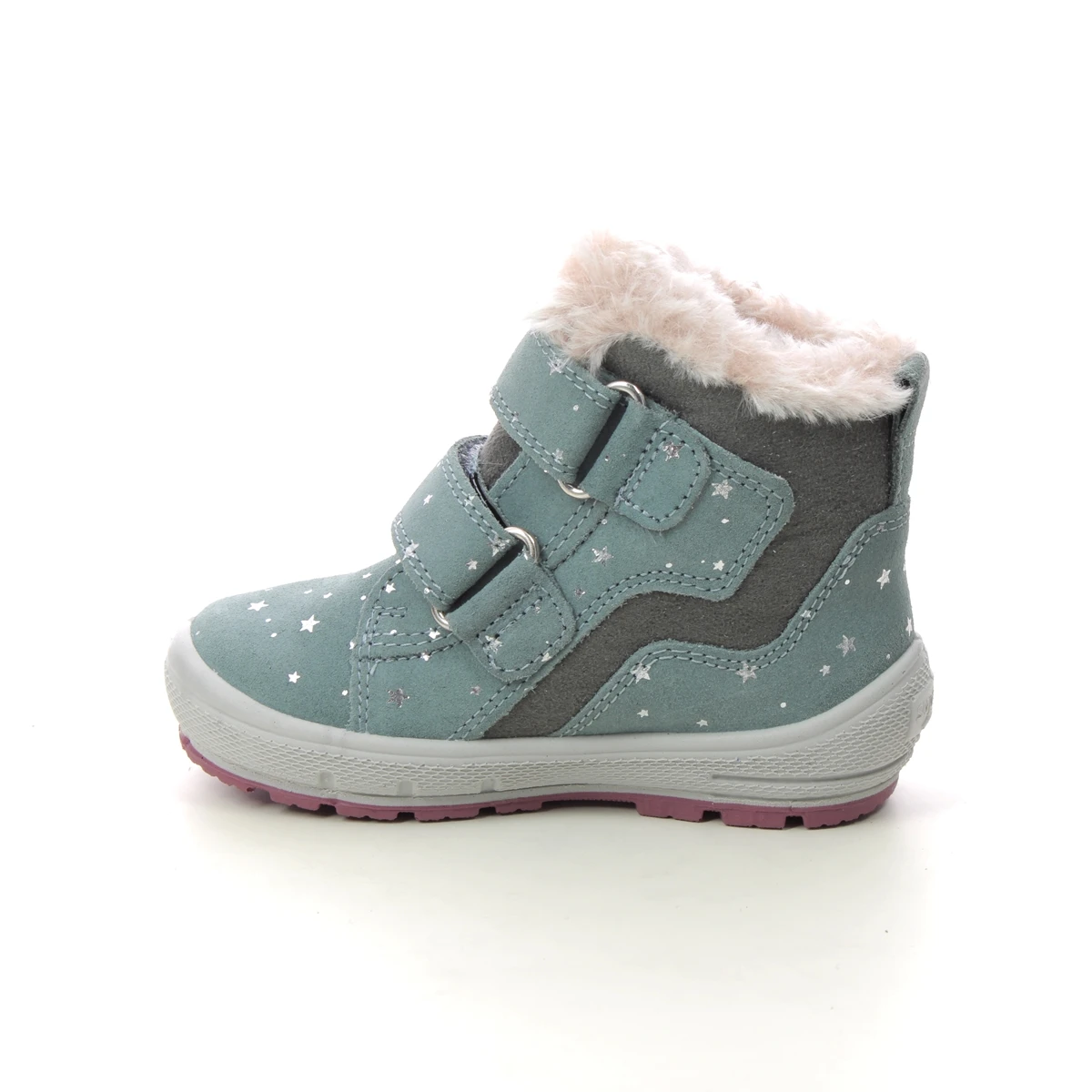 The Superfit Groovy GTX girls light blue infant boots are cute and practical. These girls snow boots have a soft suede upper in light blue decorated with silver stars and a cosy faux fur trim. There are two rip tape straps for easy fastening and the grooved outsole offers additional traction.