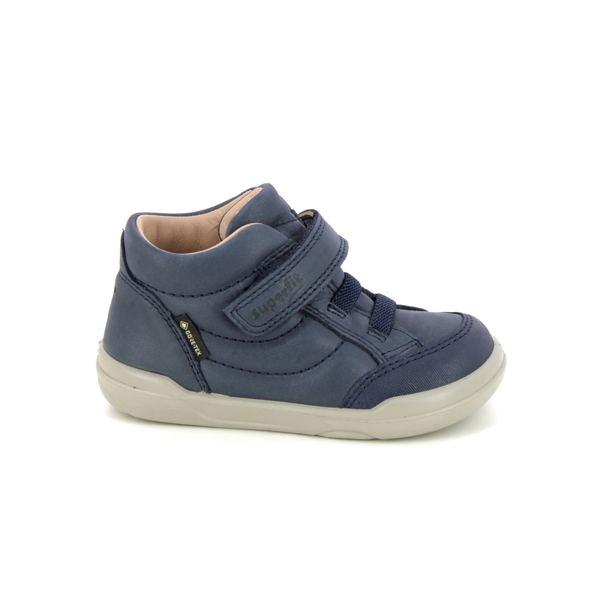 Superfit Superfree Gtx boys trainer boots are waterproof and sporty. These boys gore tex boots have a smooth leather upper with a zip and bungee lace fastening. There is a cosy man-made fleece lining perfect for keeping feet warmer in the colder weather.