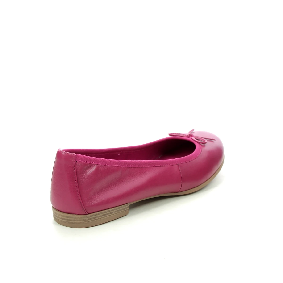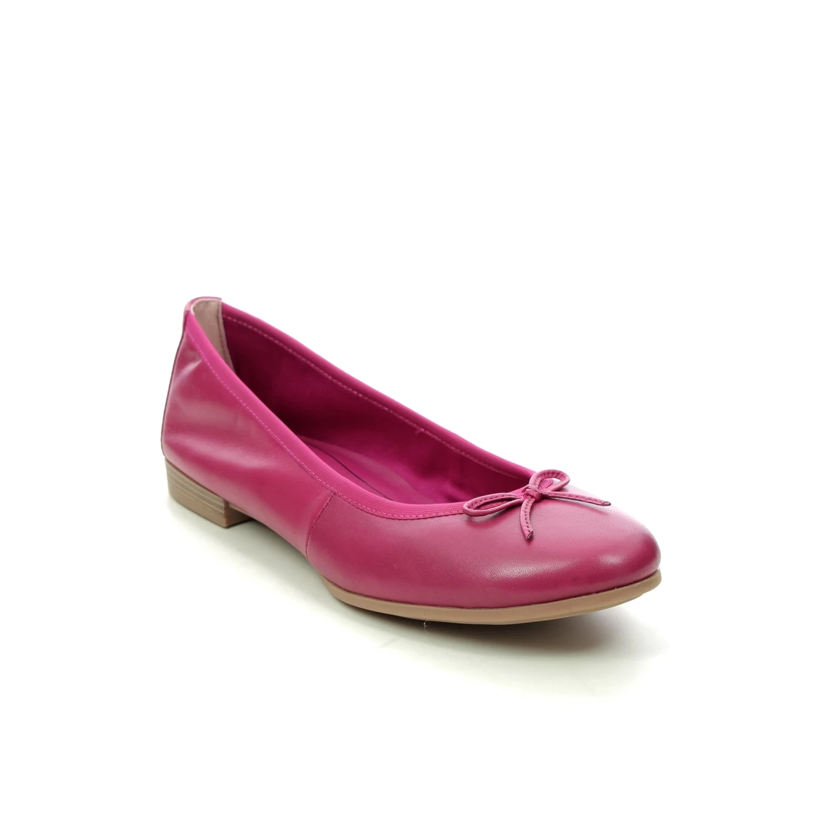 The Tamaris Alena Birago women’s fuchsia leather pumps are a pop of colour for your feet. These women’s bright pink pumps have a smooth leather upper which is breathable and flexible. These ballerina flats have a decorative bow over the toe box and rounded toe shape.