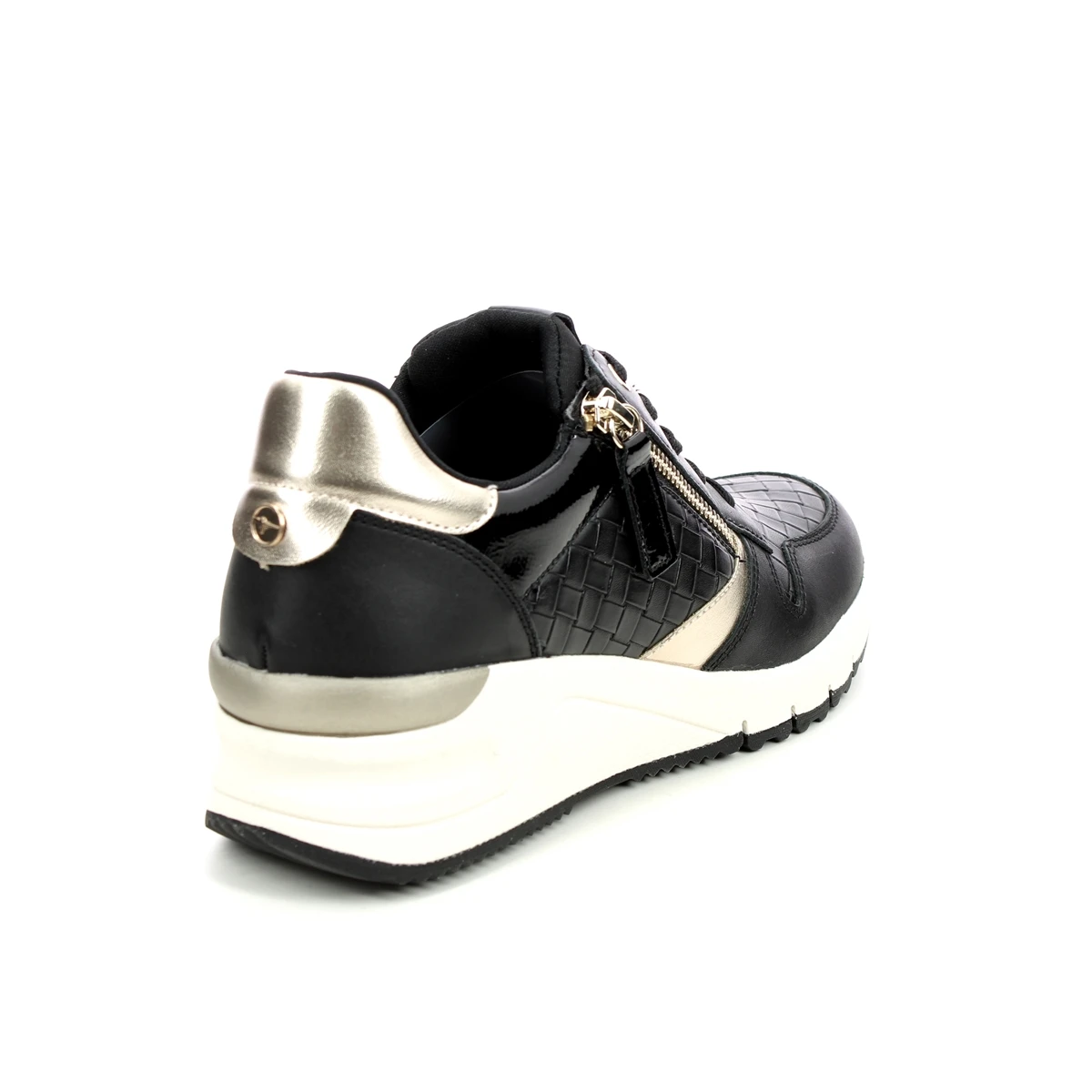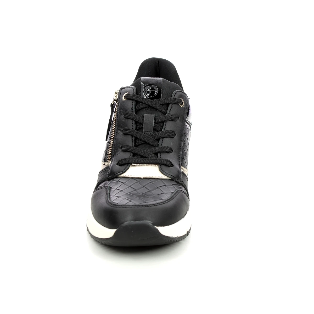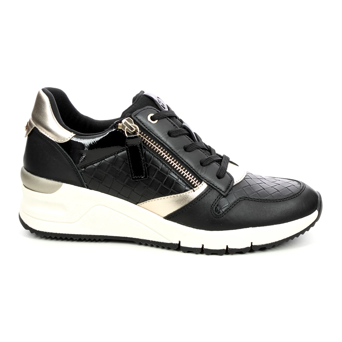 The Tamaris 23702-26-048 REA womens black trainers are bang on trend. The chunky style trainers have a gorgeous upper made from smooth leather and high-quality man-made overlays in shimmering gold. The multi-texture panels maintain the sports luxe vibe and the extra height in the 50mm heel offers additional heel support. There is a full lace-up front for an adjustable and secure fastening whilst the functional side zip allows quick and easy access. The rubber outsole extends up the toe for added durability and the padded footbed is removable offers extra width or space for additional orthotics.
