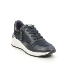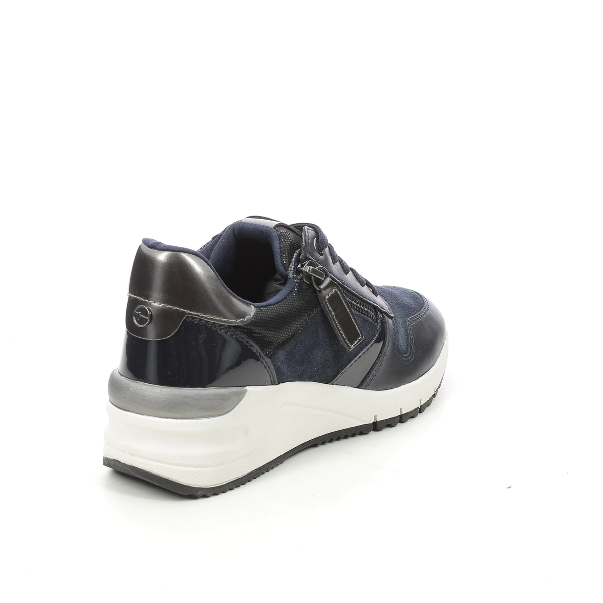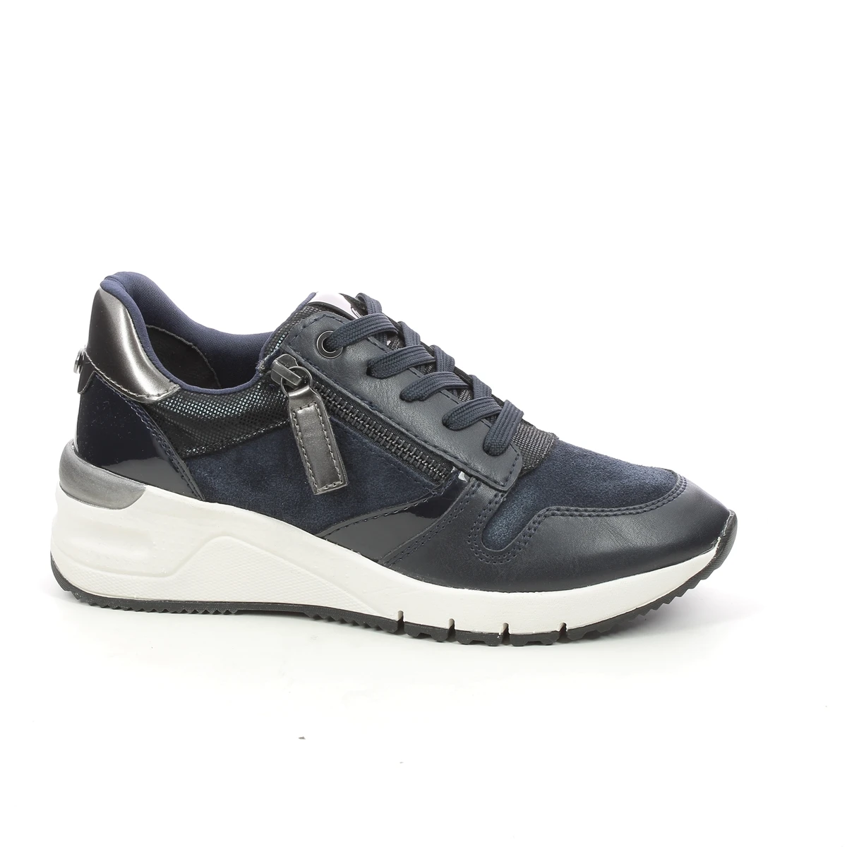 These chunky Tamaris 23702-27-890 REA ZIP WEDGE navy trainers have stylish upper made from soft leather and premium man made overlays. The multi-texture panels maintain the sports luxe vibe and the extra height in the 50mm heel offers additional heel support. There is a full lace-up front for an adjustable and secure fastening whilst the functional side zip allows quick and easy access.
