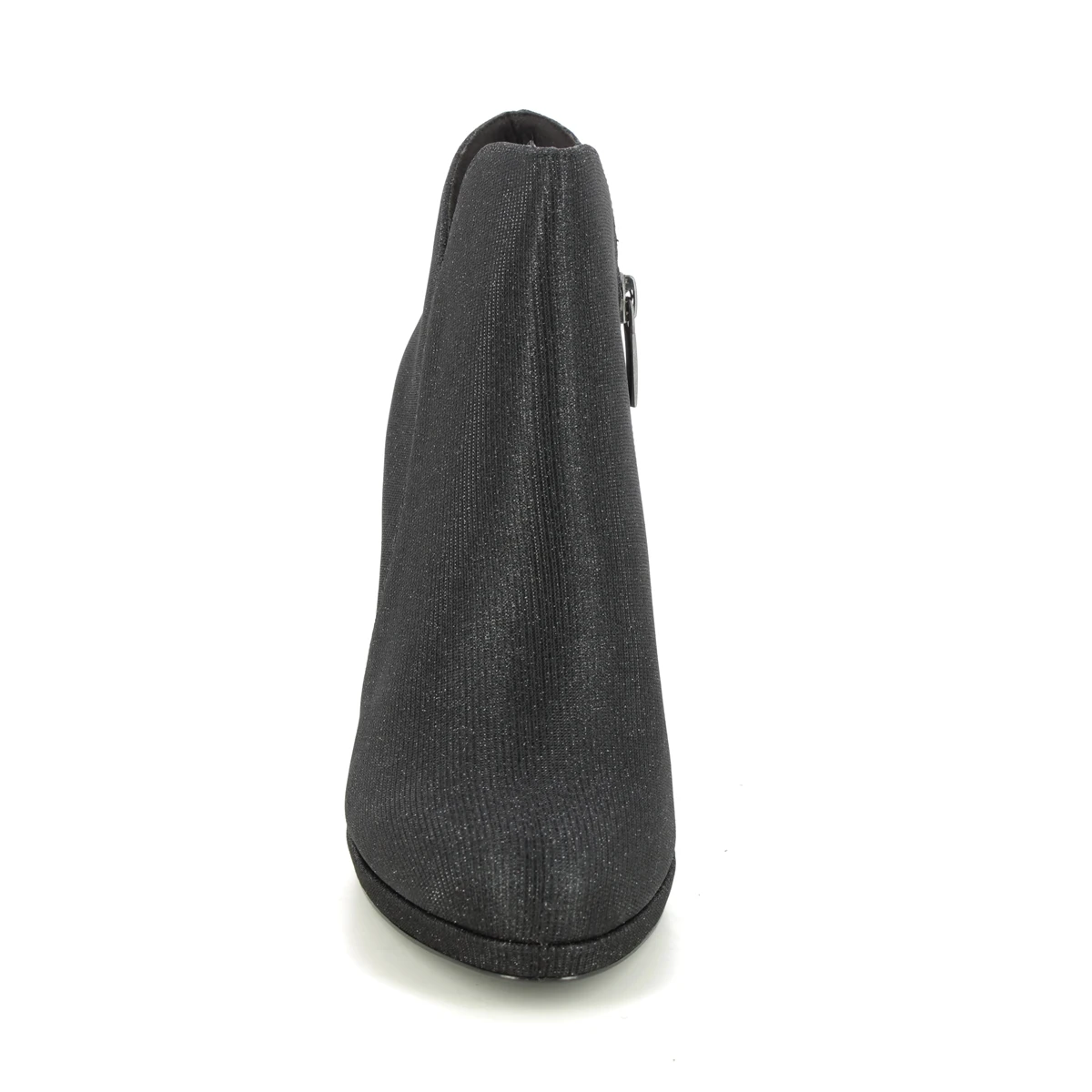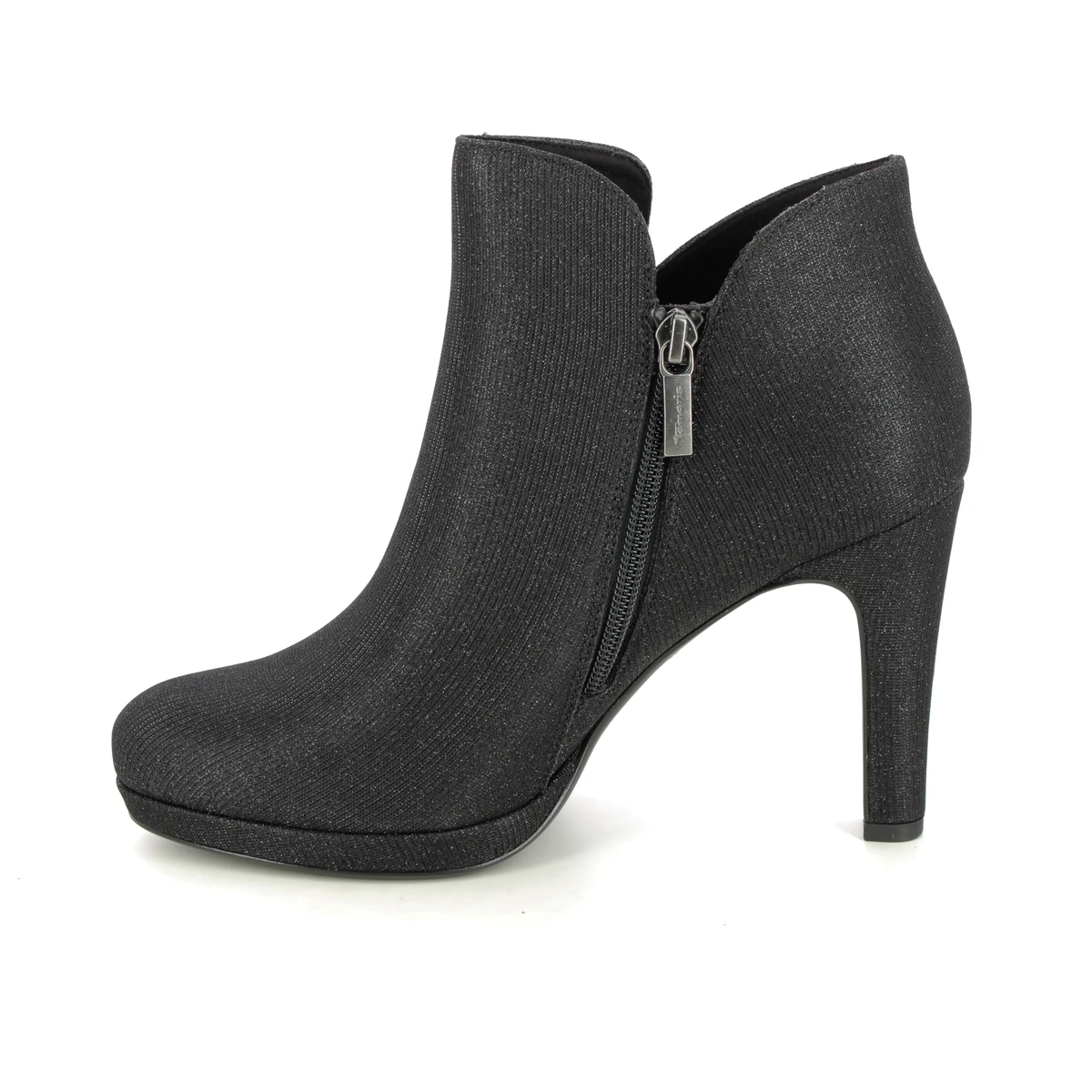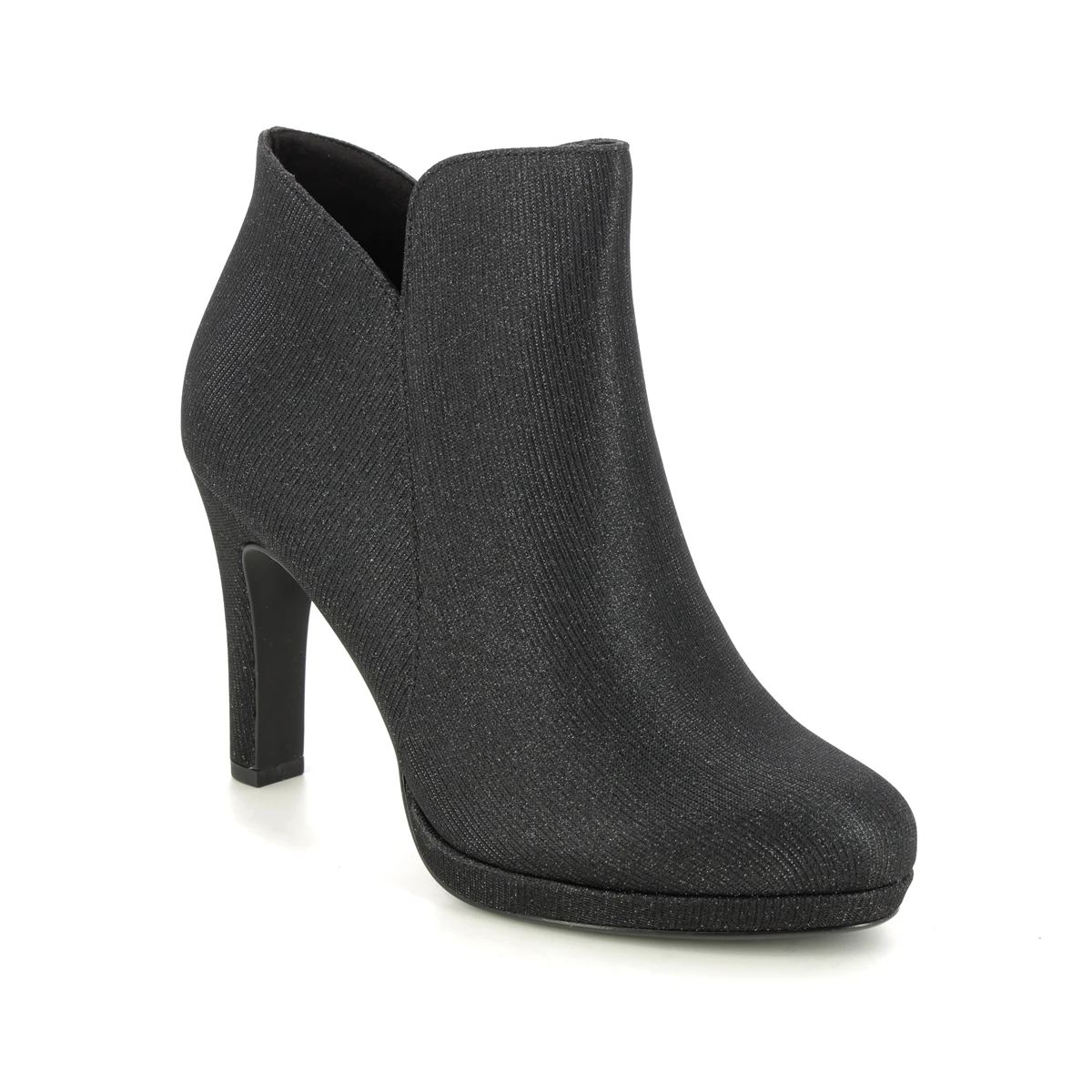 Tamaris Lycorbu Fatale women’s black shoe boots offer desk to dinner style. These women’s black heeled boots have a shimmering textile upper, with a dramatic 95mm stiletto heel.