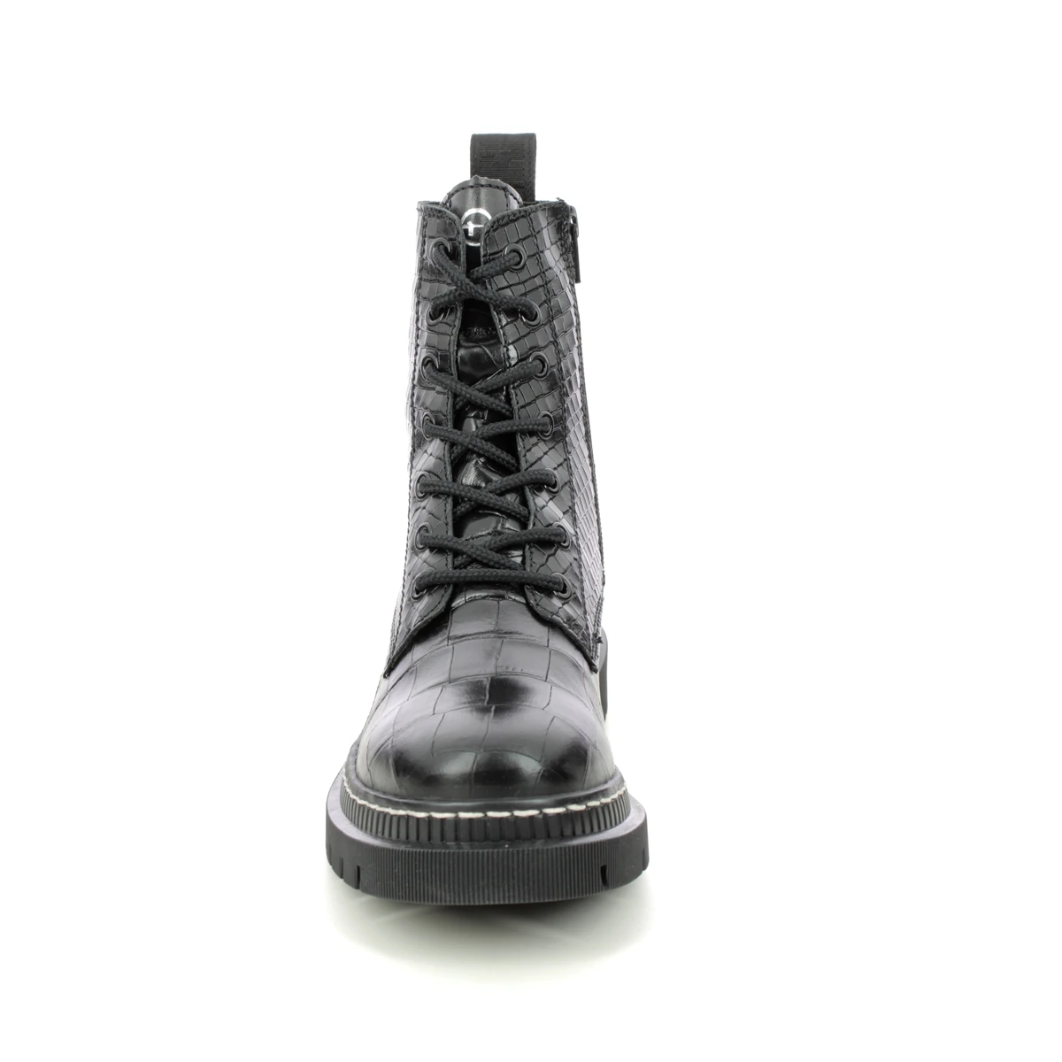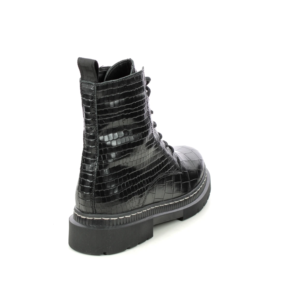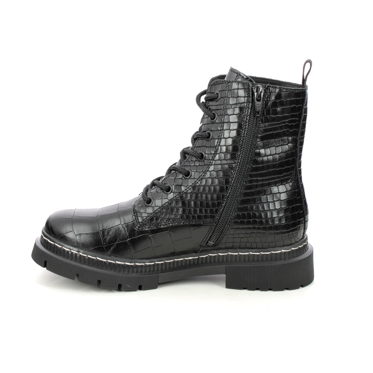 Tamaris Marisodoc womens black croc biker boots are bang on trend. These black biker boots have a croc texture leather upper with chunky cleated outsole for a contemporary vibe. The white contrast stitching adds a Doc Marten vibe whilst the zip and lace dual fastening combines easy foot entry with a secure and adjustable fit. Removable insoles add another practical element allowing space for your own orthotics or additional width if required.