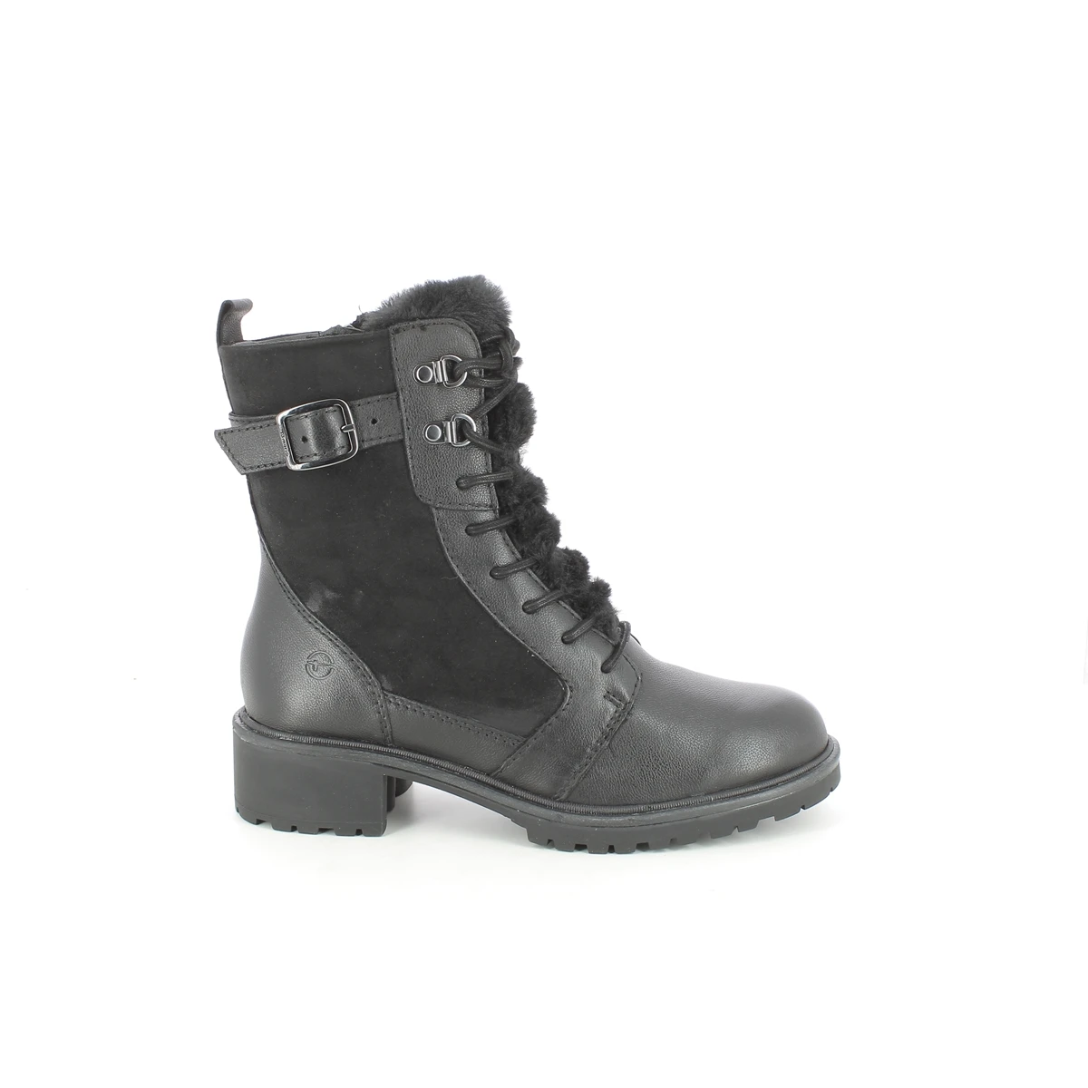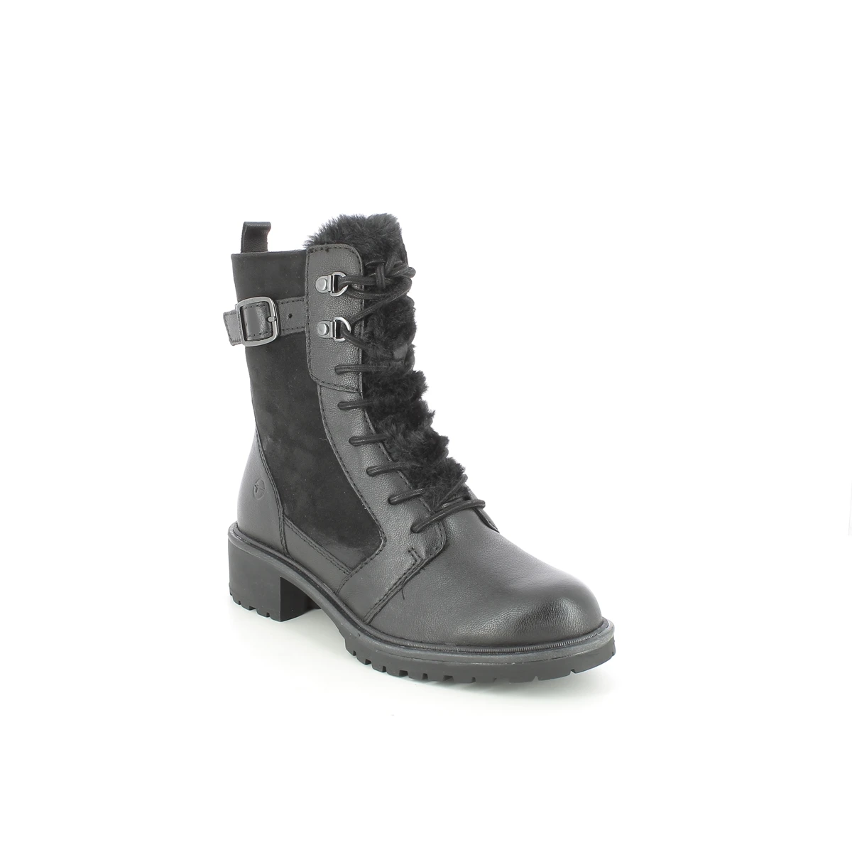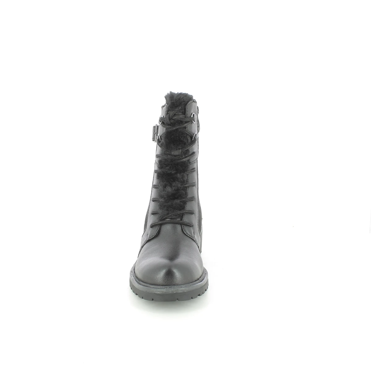 Update your this season wardrobe instantly with the Tamaris 26212-27-001 ABINATALUES 15 in black leather with textile panels. The lace up style with 40mm heel ensures an elegant style while the inside zip makes them easy to take on and off. The chunky sole unit is cleated for additional traction and the faux fur lined tongue adds some extra warmth.