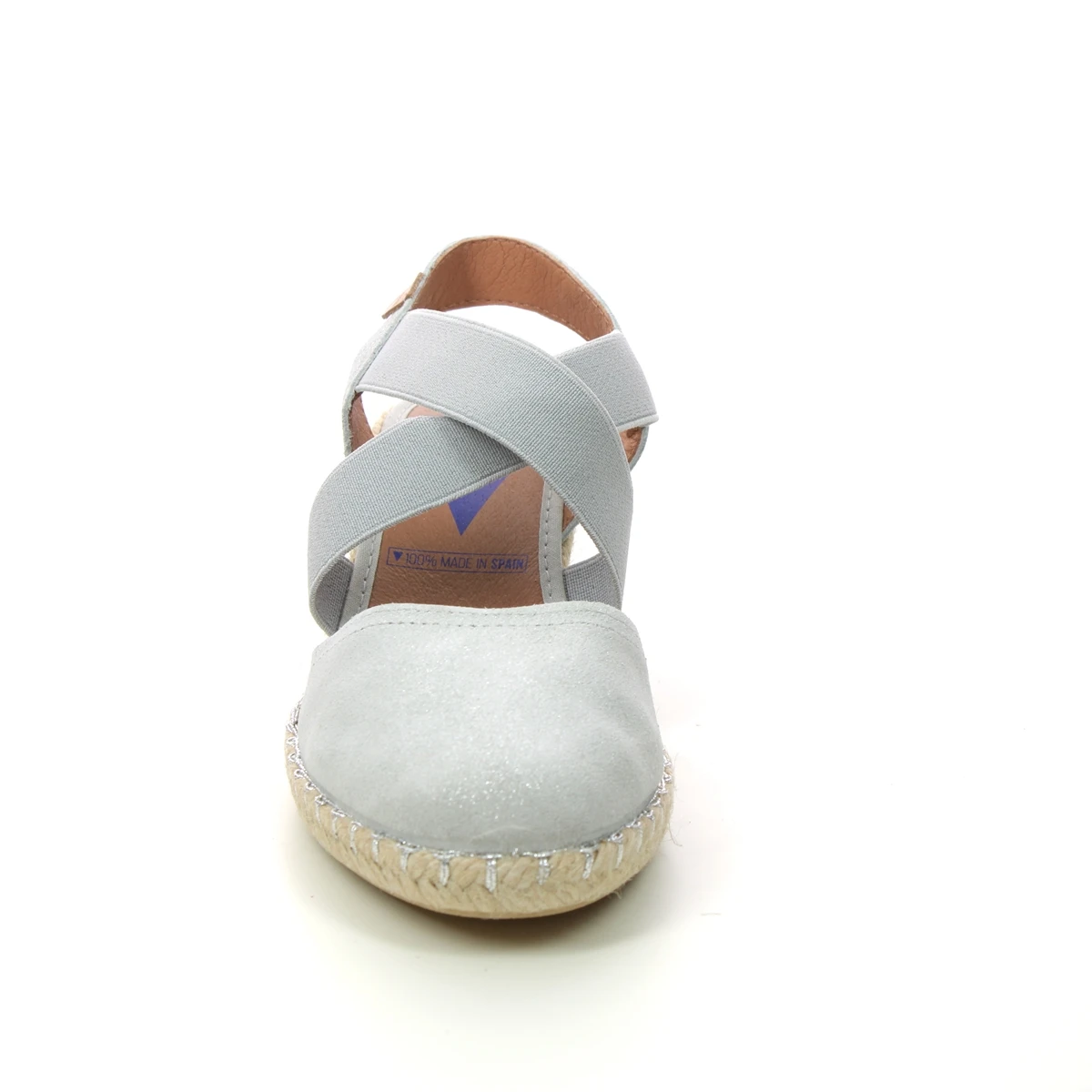 The Verbenas Mila women’s silver espadrilles are sparkly and comfy. These women’s silver wedge sandals have a closed toe box made of smooth leather. There are stretchy elastic straps which crossover straps for a flattering fit, whilst the padded leather footbed offers excellent comfort underfoot. The jute covered wedge heel measures 60mm for extra height underfoot, whilst the subtle sparkle make them ideal for comfy wedding shoes.